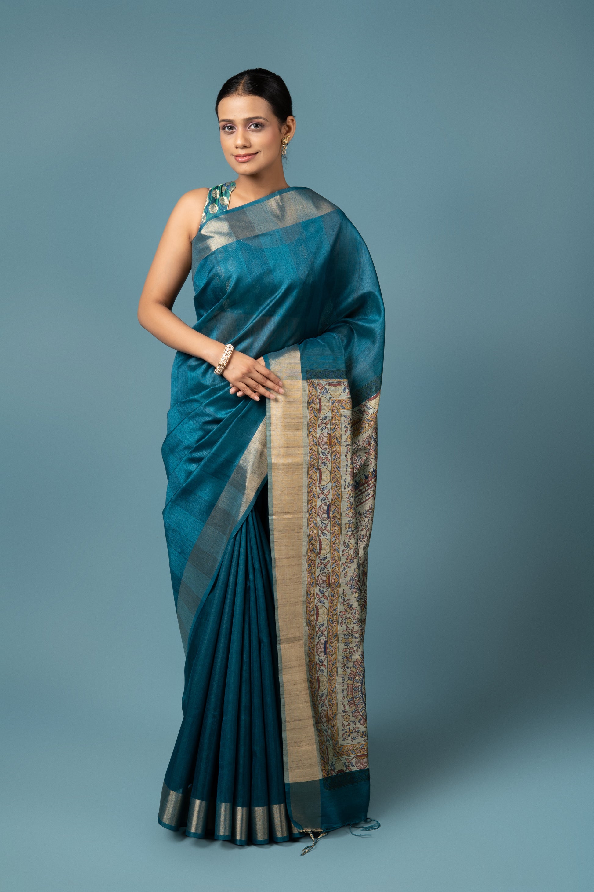 Peacock Blue Tussar Silk Saree With Madhubani Print