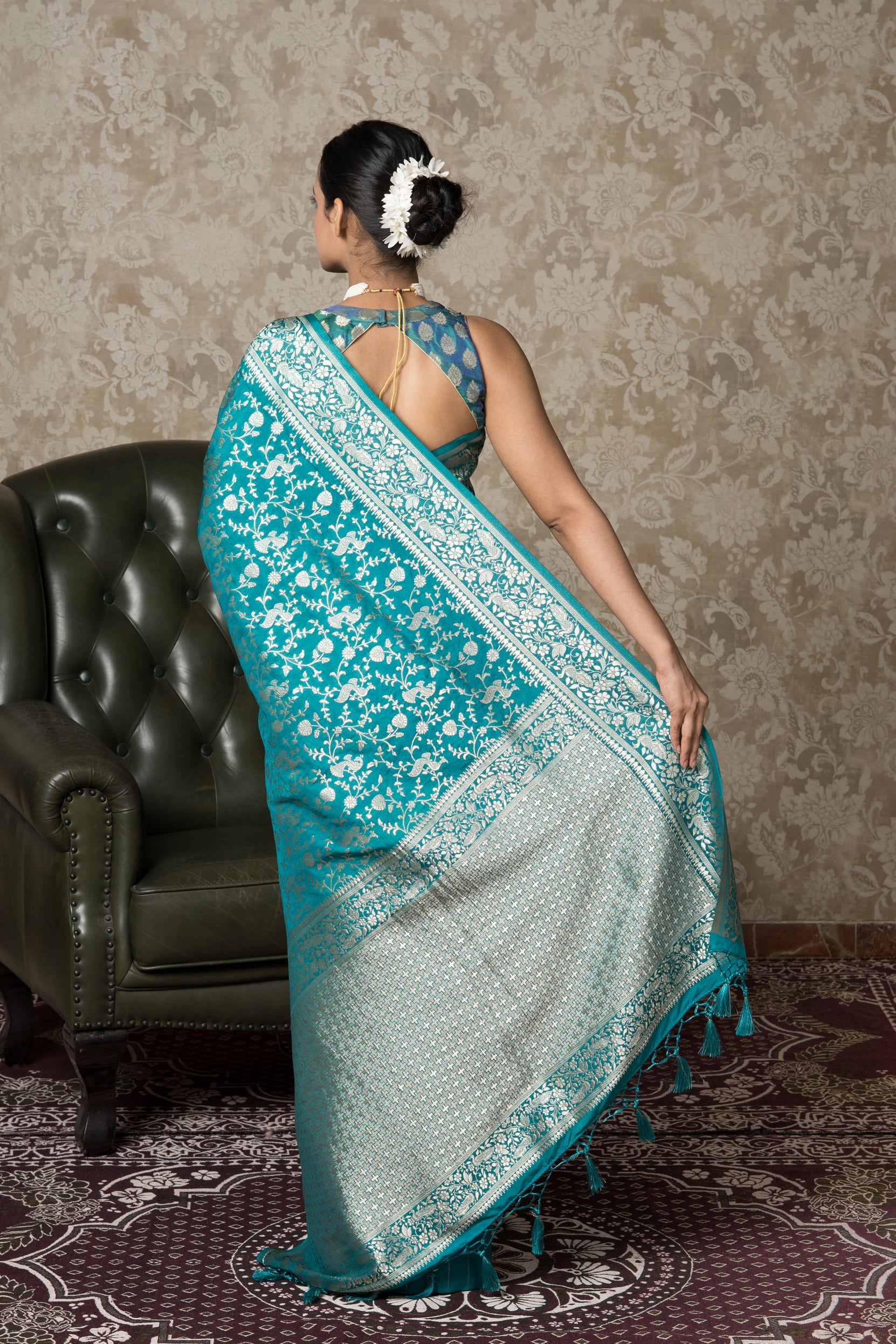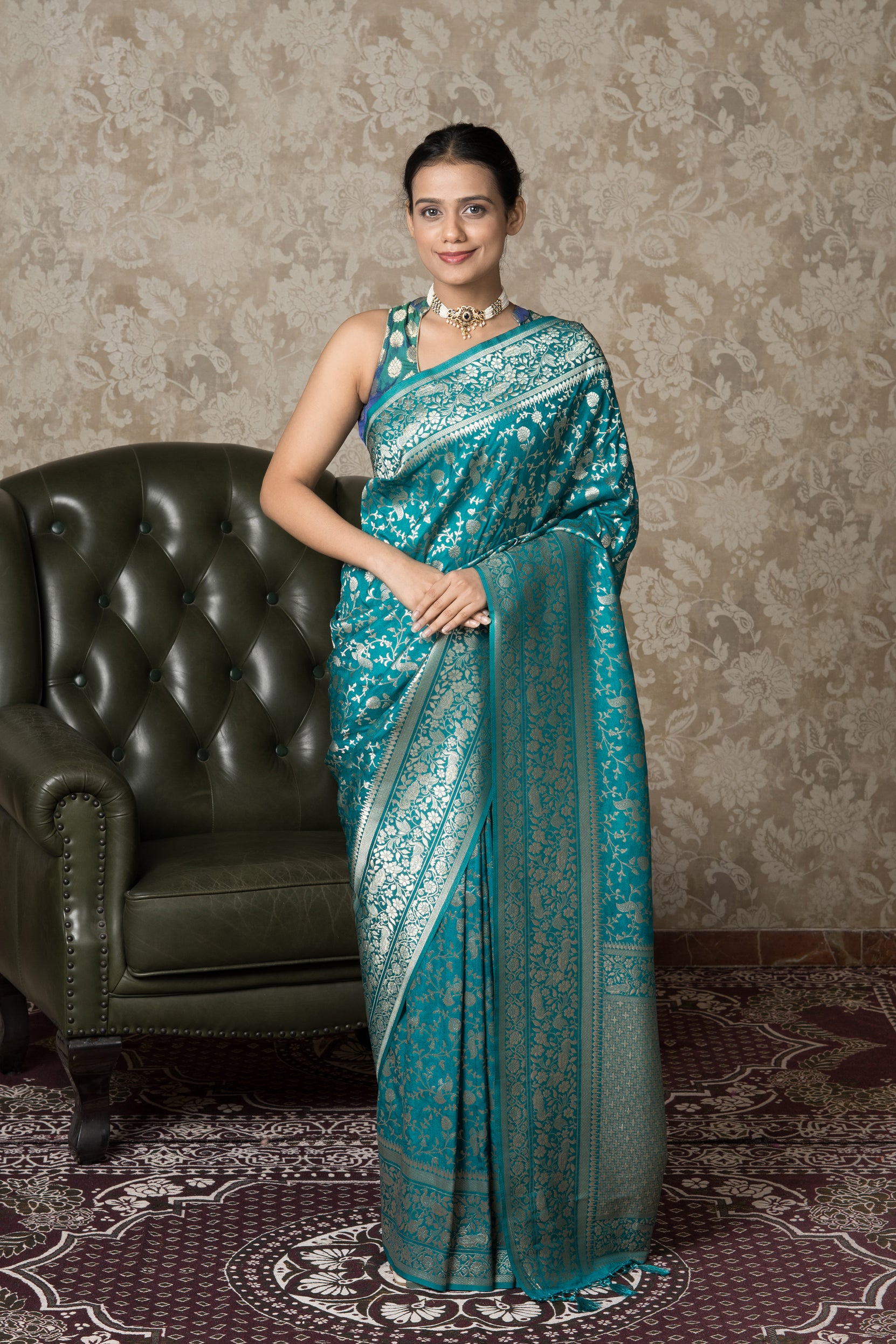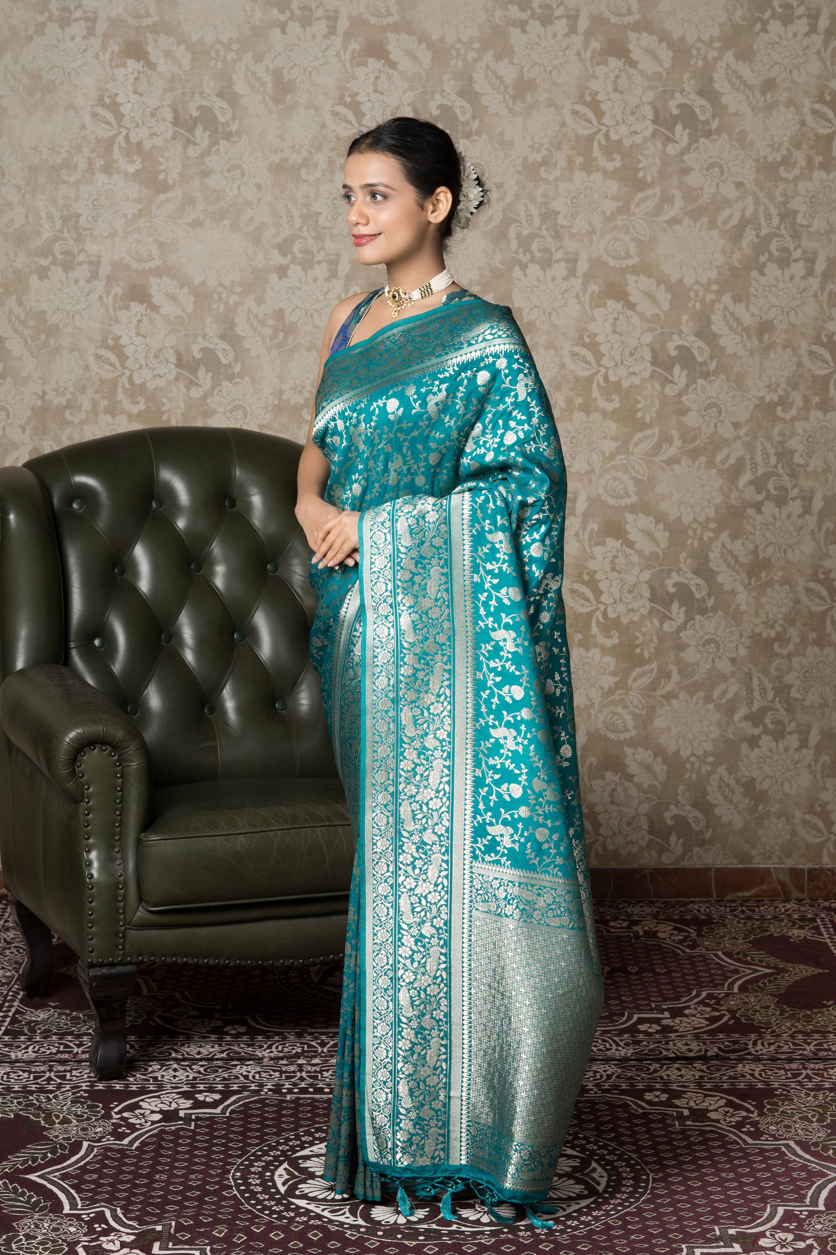 Elevate your wardrobe with our exclusive Peacock Green Katan Silk Banarasi Saree. Featuring a beautiful Peacock Green hue, this piece effortlessly blends timeless tradition with modern elegance. Ideal for festive occasions or everyday sophistication. Shop now and make it yours.
