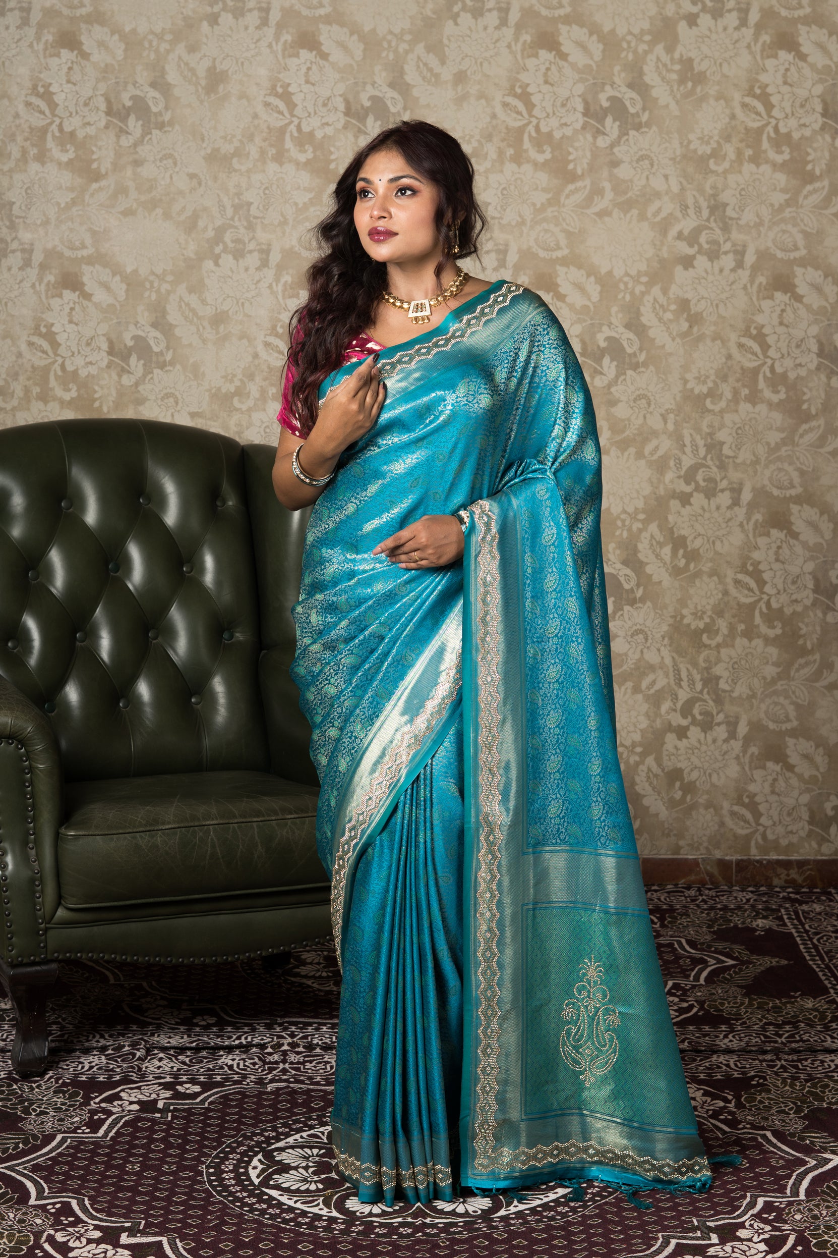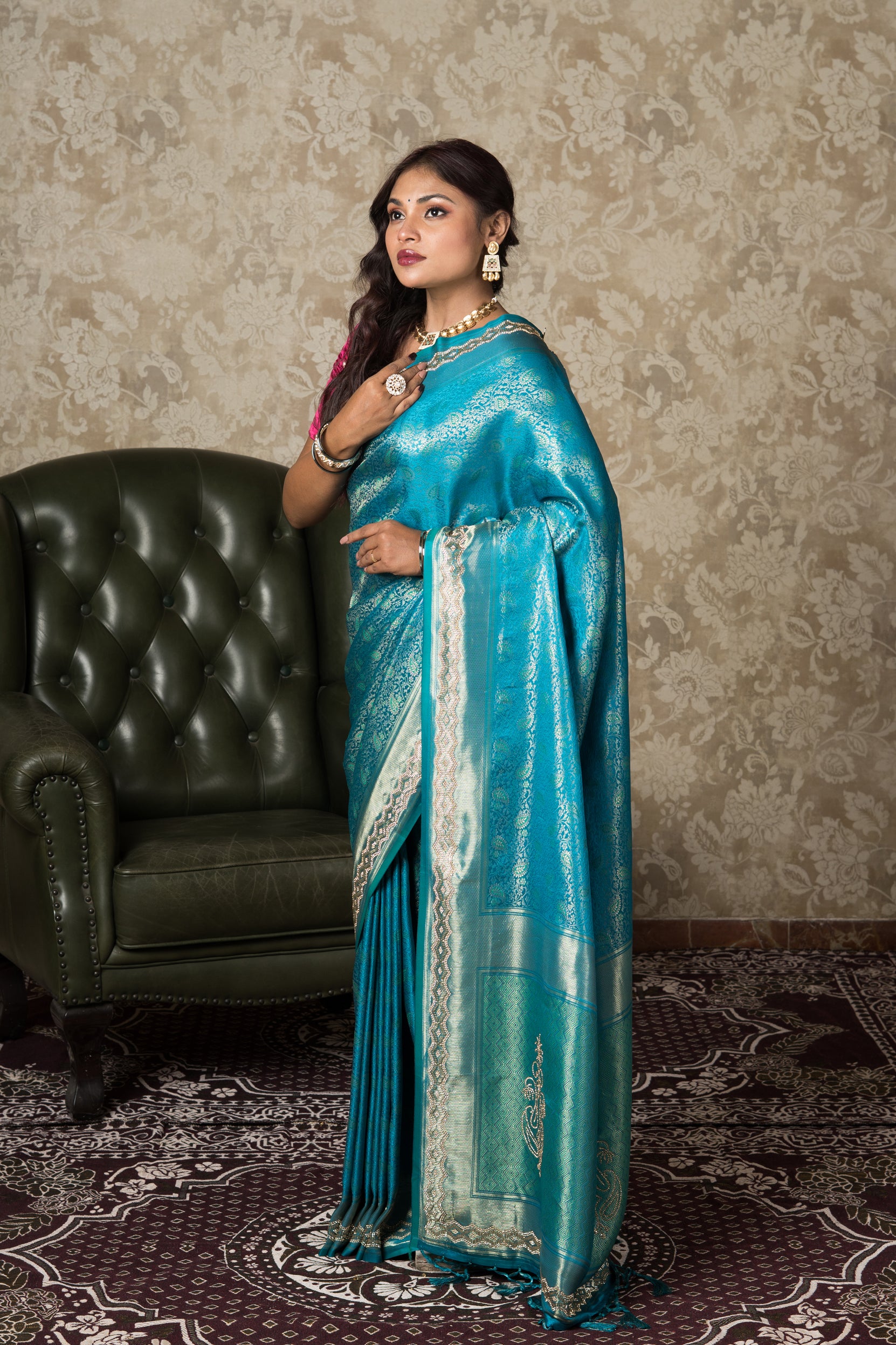 Elevate your wardrobe with our exclusive Peacock Green Katan Silk Banarasi Saree with Stonework. Featuring a beautiful Peacock Green hue, this piece effortlessly blends timeless tradition with modern elegance. Ideal for festive occasions or everyday sophistication. Shop now and make it yours.