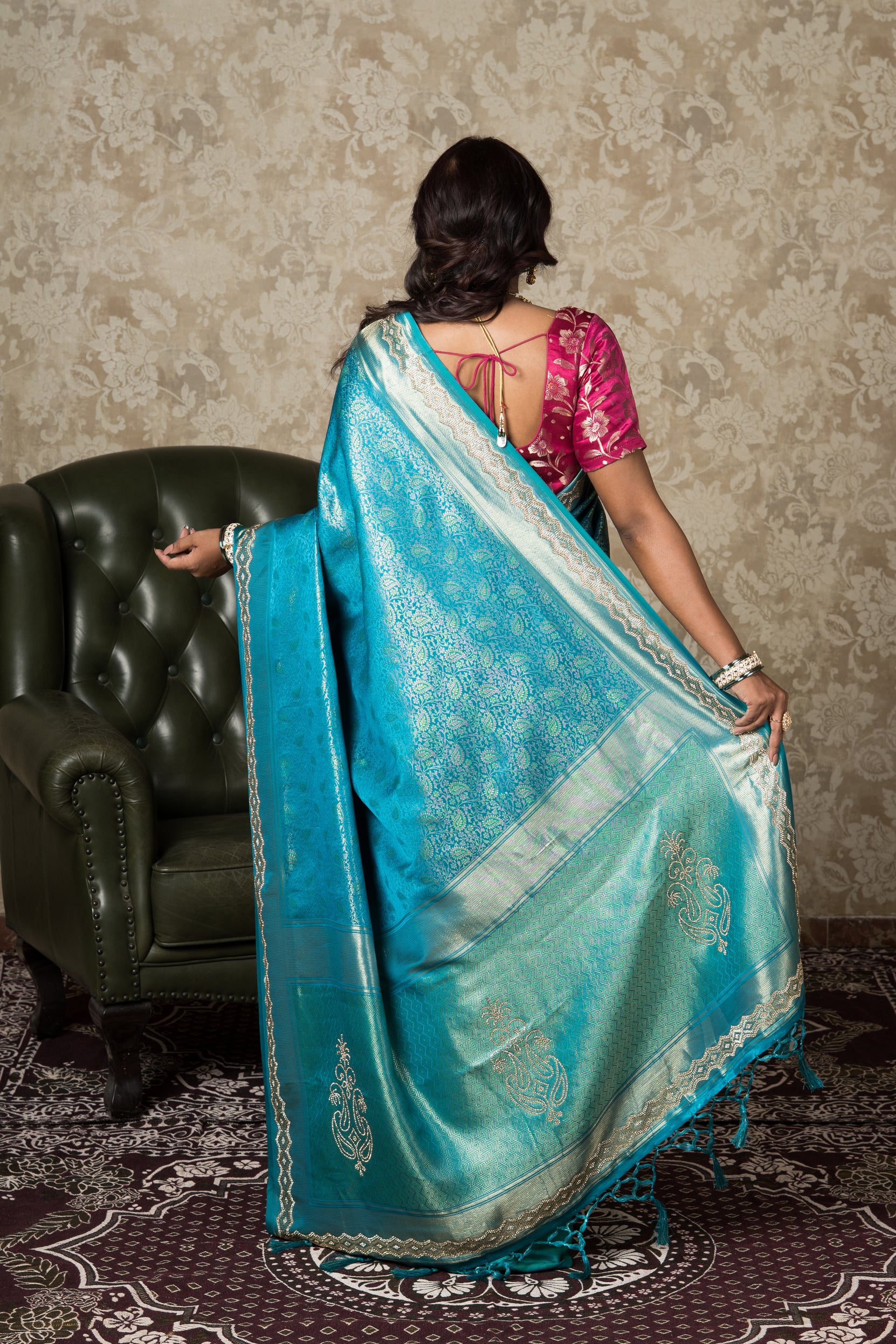 Peacock Green Katan Silk Banarasi Saree With Stonework