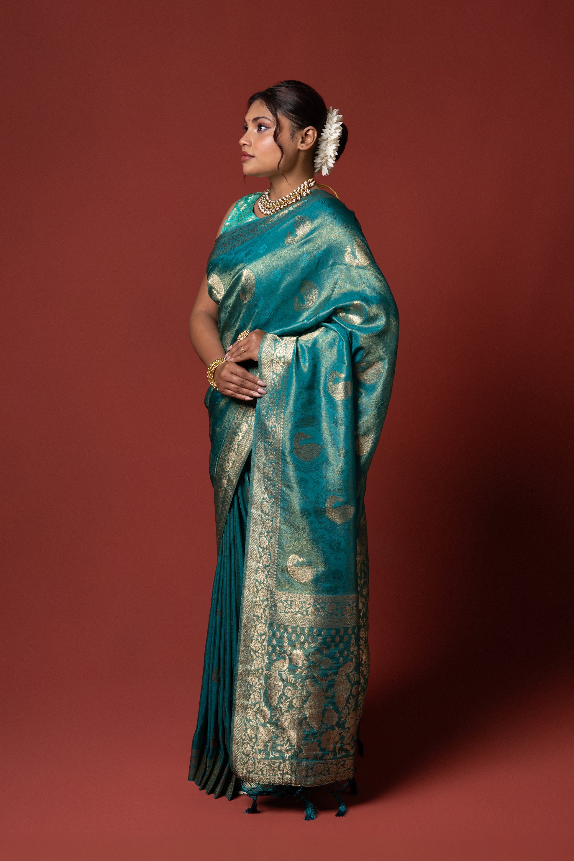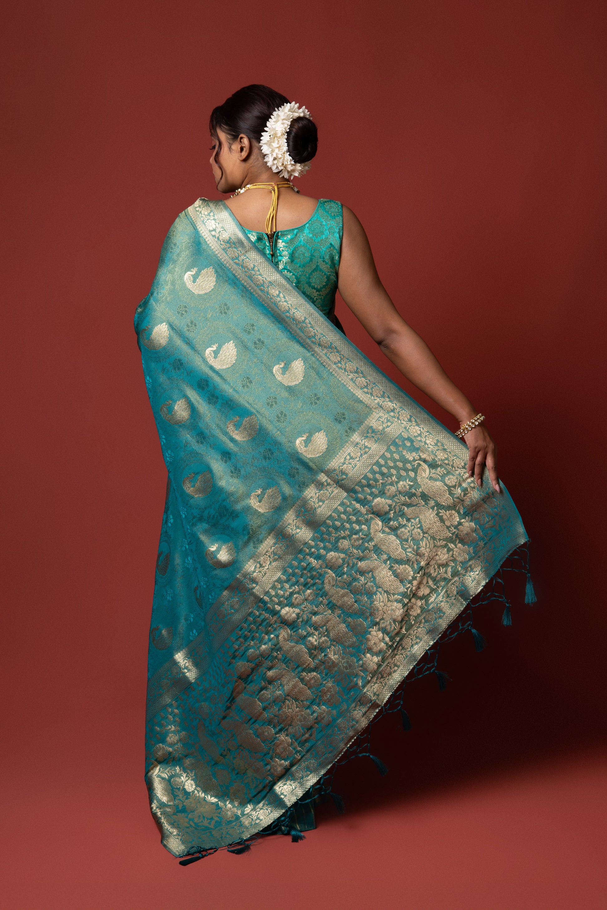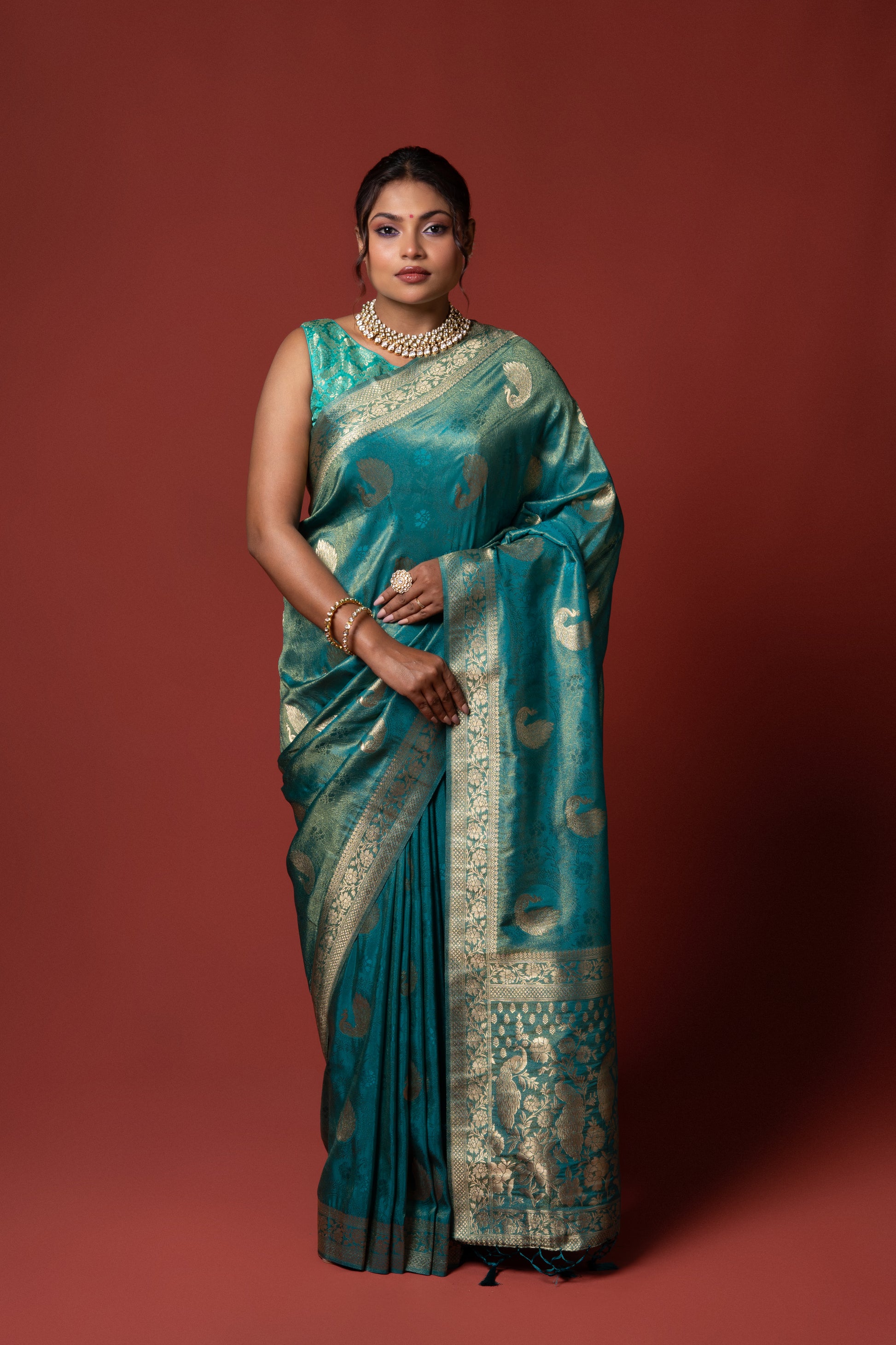 Elevate your wardrobe with our exclusive Peacock Green Tissue Silk Saree. Featuring a beautiful Peacock Green hue, this piece effortlessly blends timeless tradition with modern elegance. Ideal for festive occasions or everyday sophistication. Shop now and make it yours.