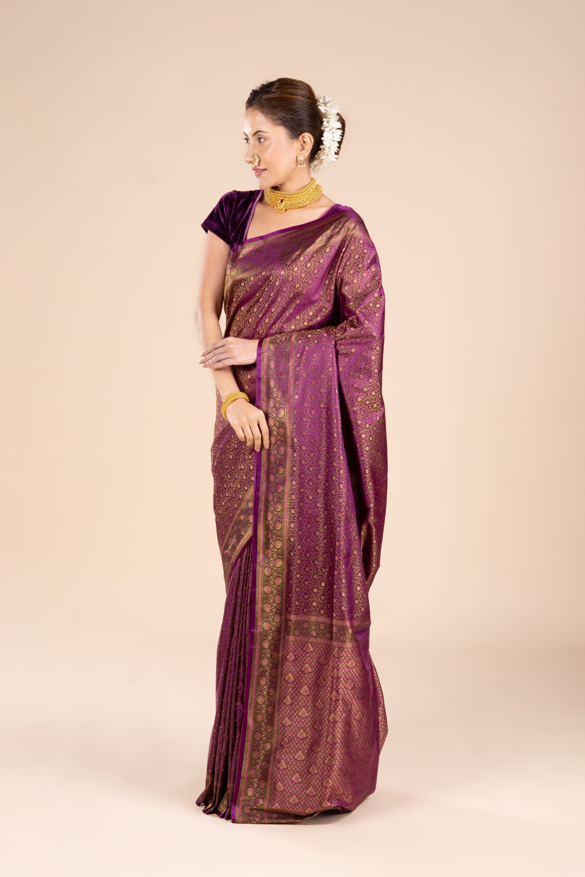 Turn heads at any celebration with this charming Purple Soft Silk Banarasi Saree. The high-quality weave provides a fluid drape and an elegant fall. Suited for traditional rituals, engagements, and festive evenings. Complement it with elegant bangles and earrings for a regal finish.