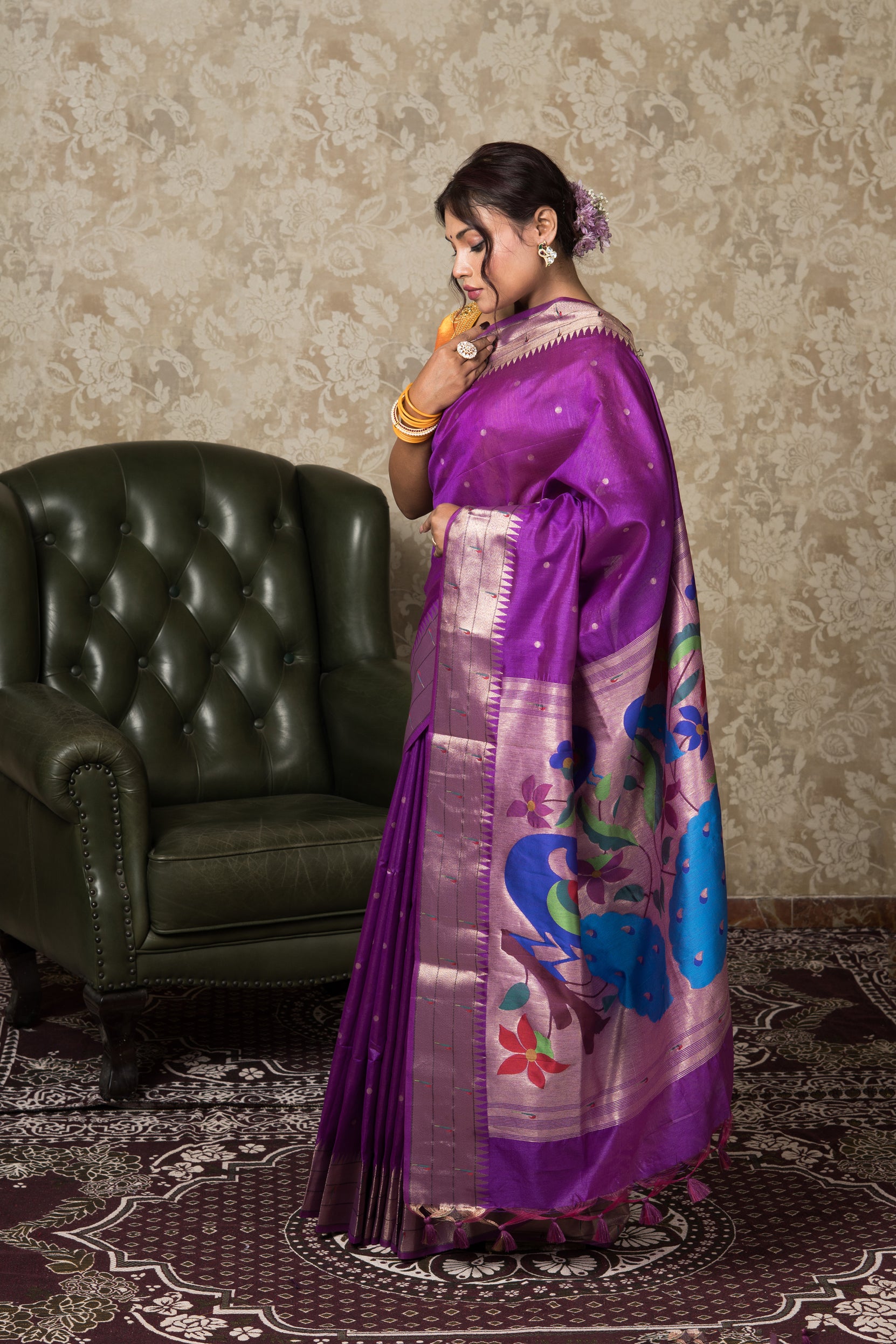 Elevate your wardrobe with our exclusive Purple Tussar Silk Paithani Saree. Featuring a beautiful Purple hue, this piece effortlessly blends timeless tradition with modern elegance. Ideal for festive occasions or everyday sophistication. Shop now and make it yours.