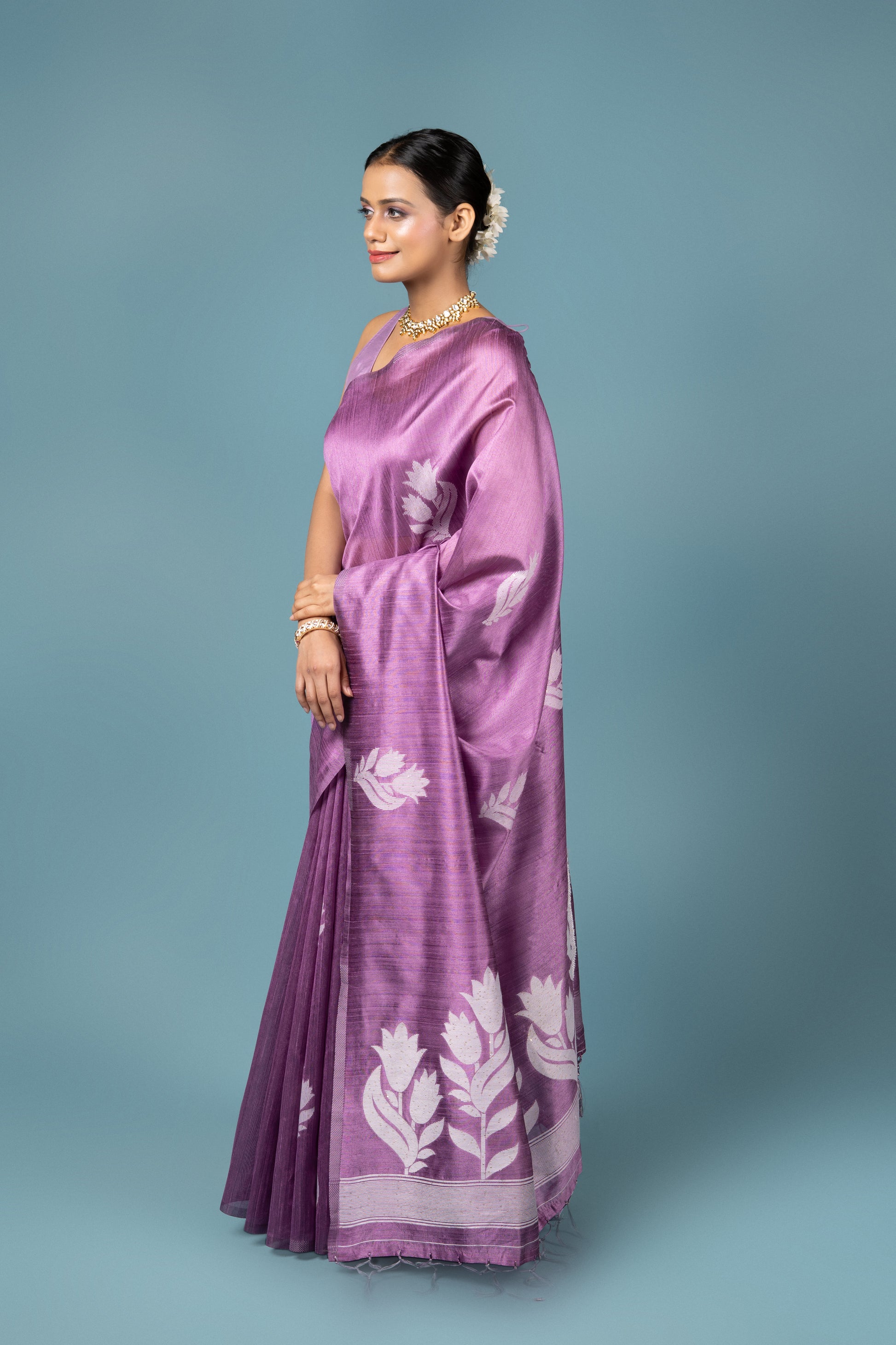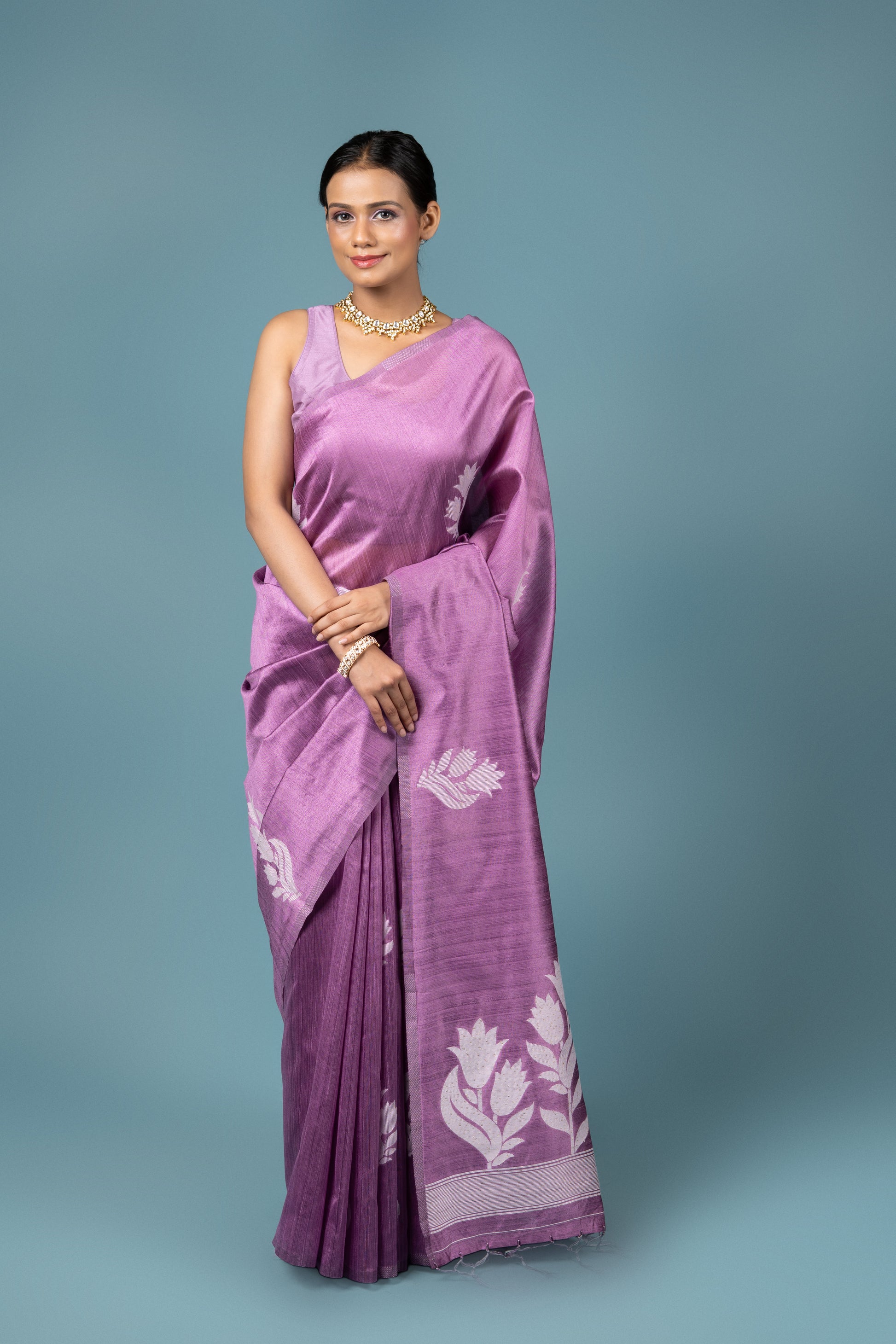 Grace meets elegance in this stunning Purple Tussar Silk Saree. Woven from rich tussar silk, the saree features a soft, natural texture with a subtle sheen that enhances its luxurious appeal. The delicate floral motifs in contrasting tones add a touch of timeless charm, making it perfect for festive occasions, traditional celebrations, or elegant evening gatherings.