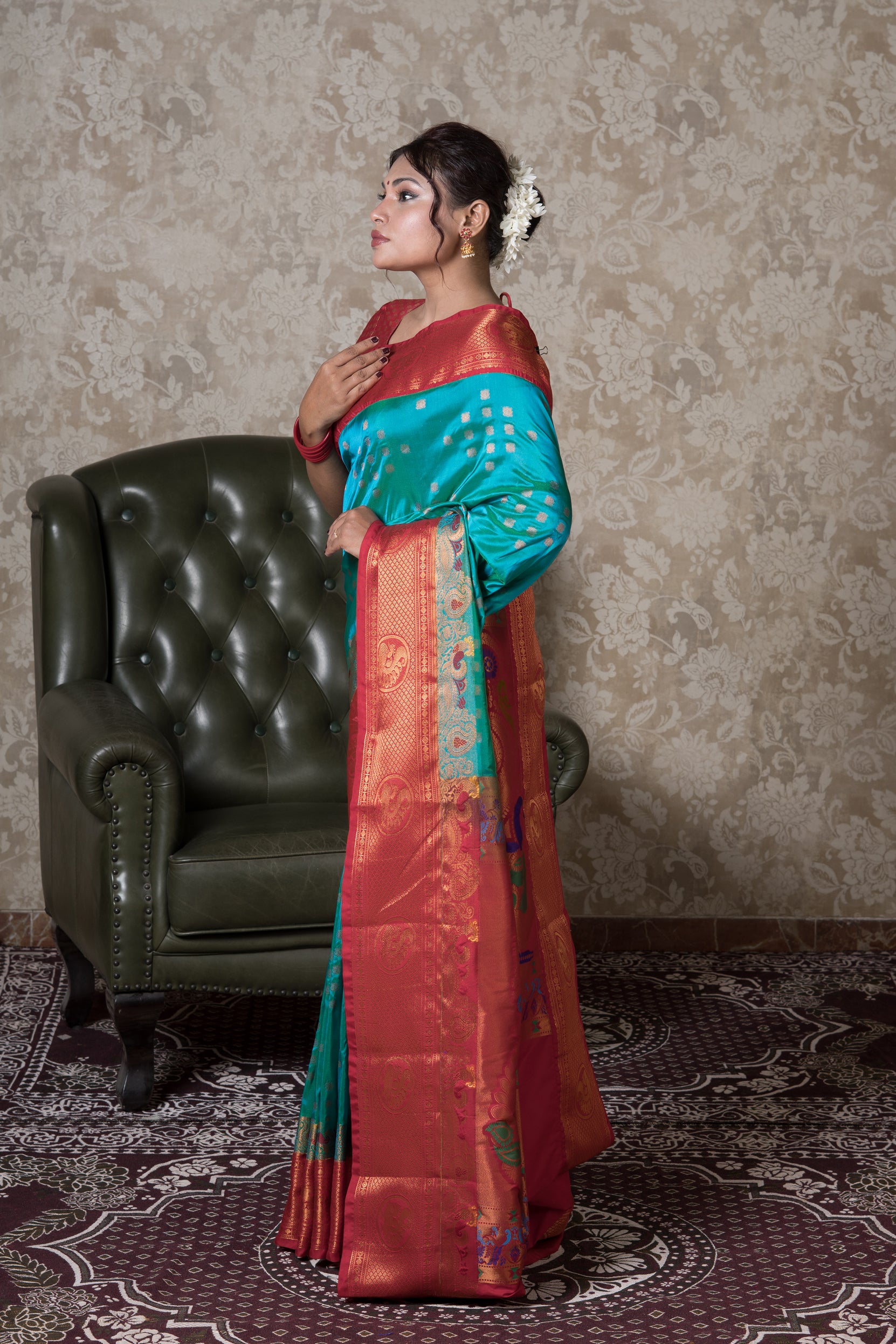 Elevate your wardrobe with our exclusive Rama Green Apurva Silk Kanjivaram Saree. Featuring a beautiful Rama Green hue, this piece effortlessly blends timeless tradition with modern elegance. Ideal for festive occasions or everyday sophistication. Shop now and make it yours.