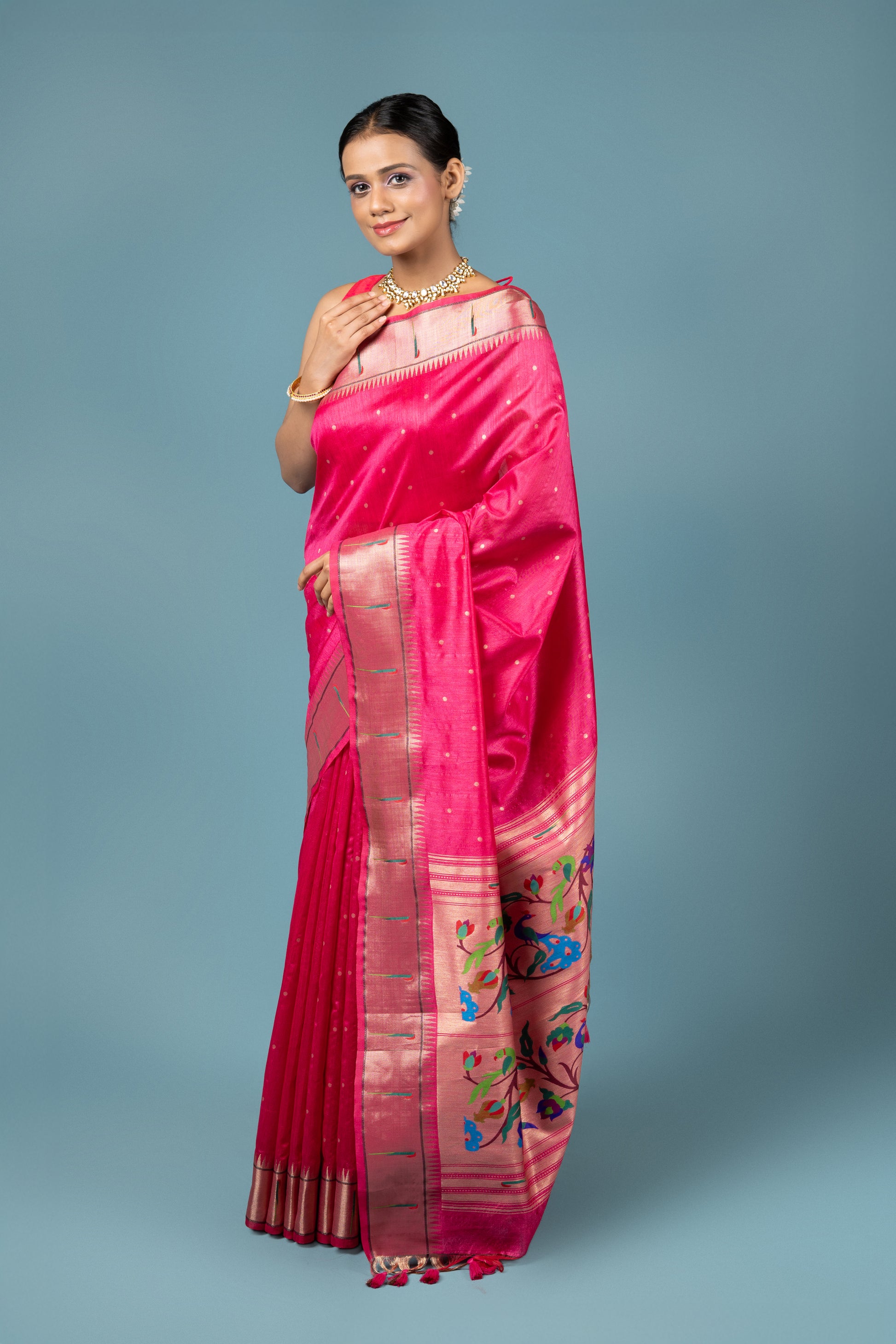 Elevate your wardrobe with our exclusive Rani Pink Tussar Silk Paithani Saree. Featuring a beautiful Rani Pink hue, this piece effortlessly blends timeless tradition with modern elegance. Ideal for festive occasions or everyday sophistication. Shop now and make it yours.