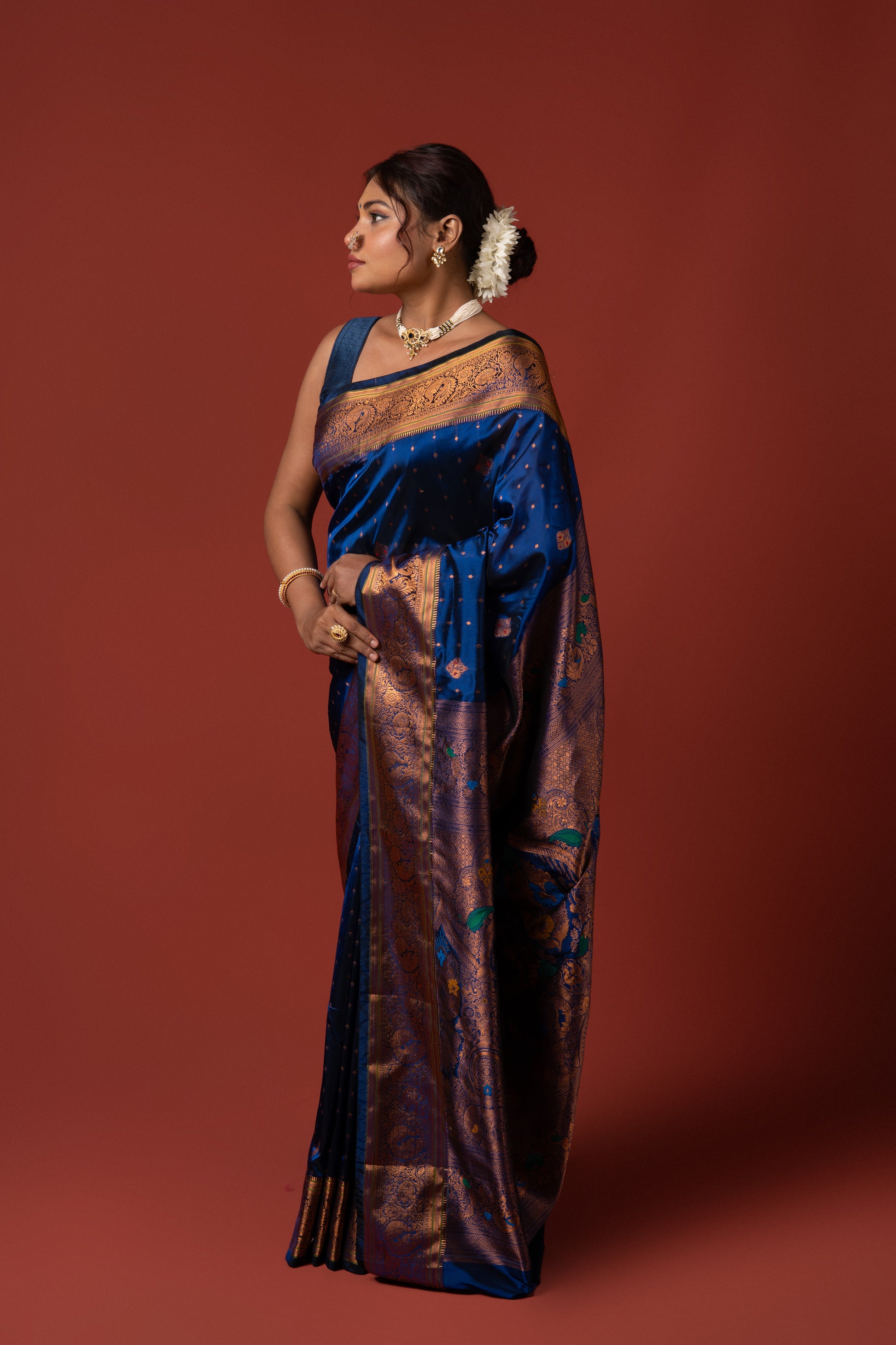 Elevate your wardrobe with our exclusive Royal Blue Apurva Silk Paithani Saree. Featuring a beautiful Royal Blue hue, this piece effortlessly blends timeless tradition with modern elegance. Ideal for festive occasions or everyday sophistication. Shop now and make it yours.
