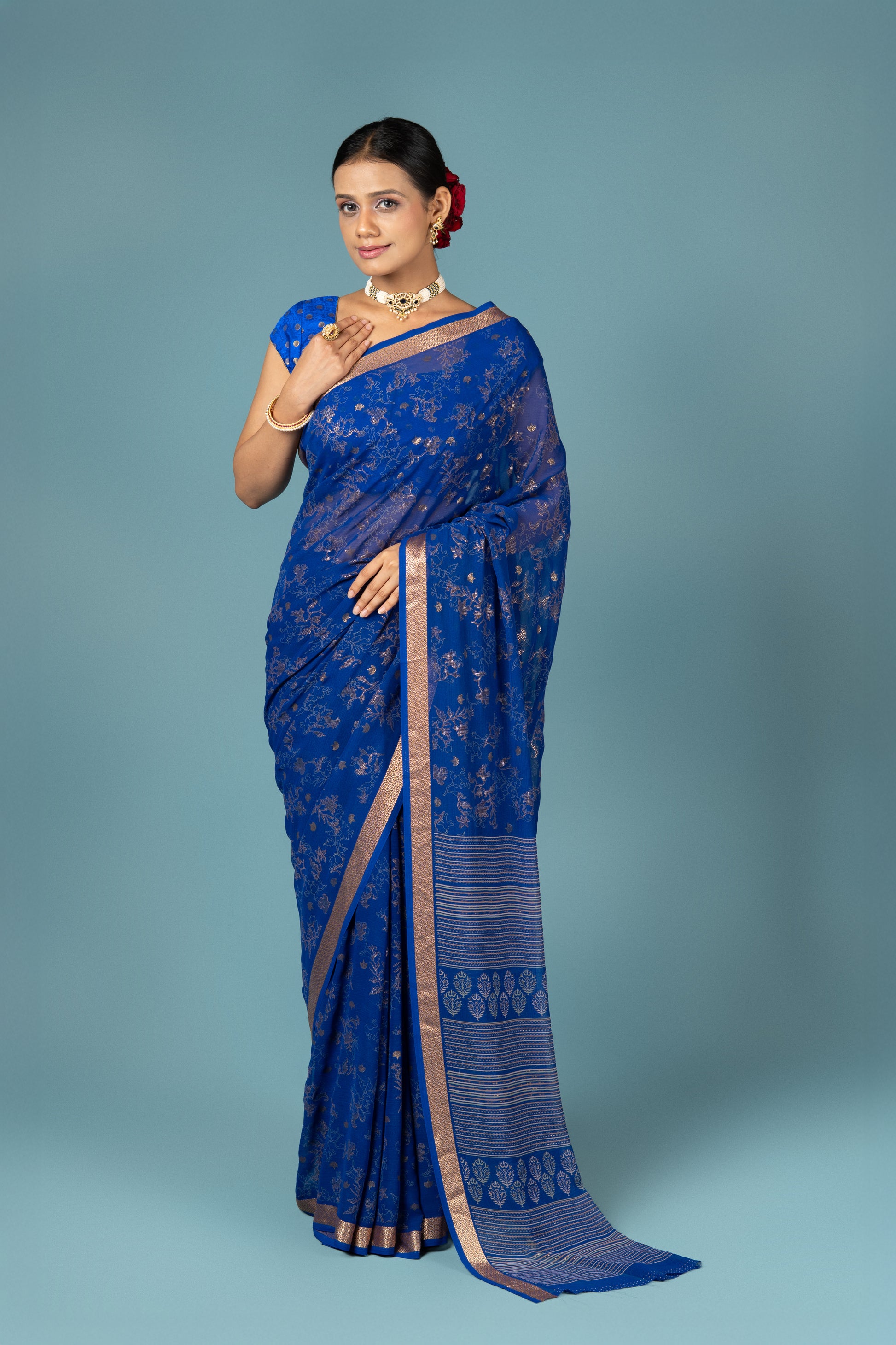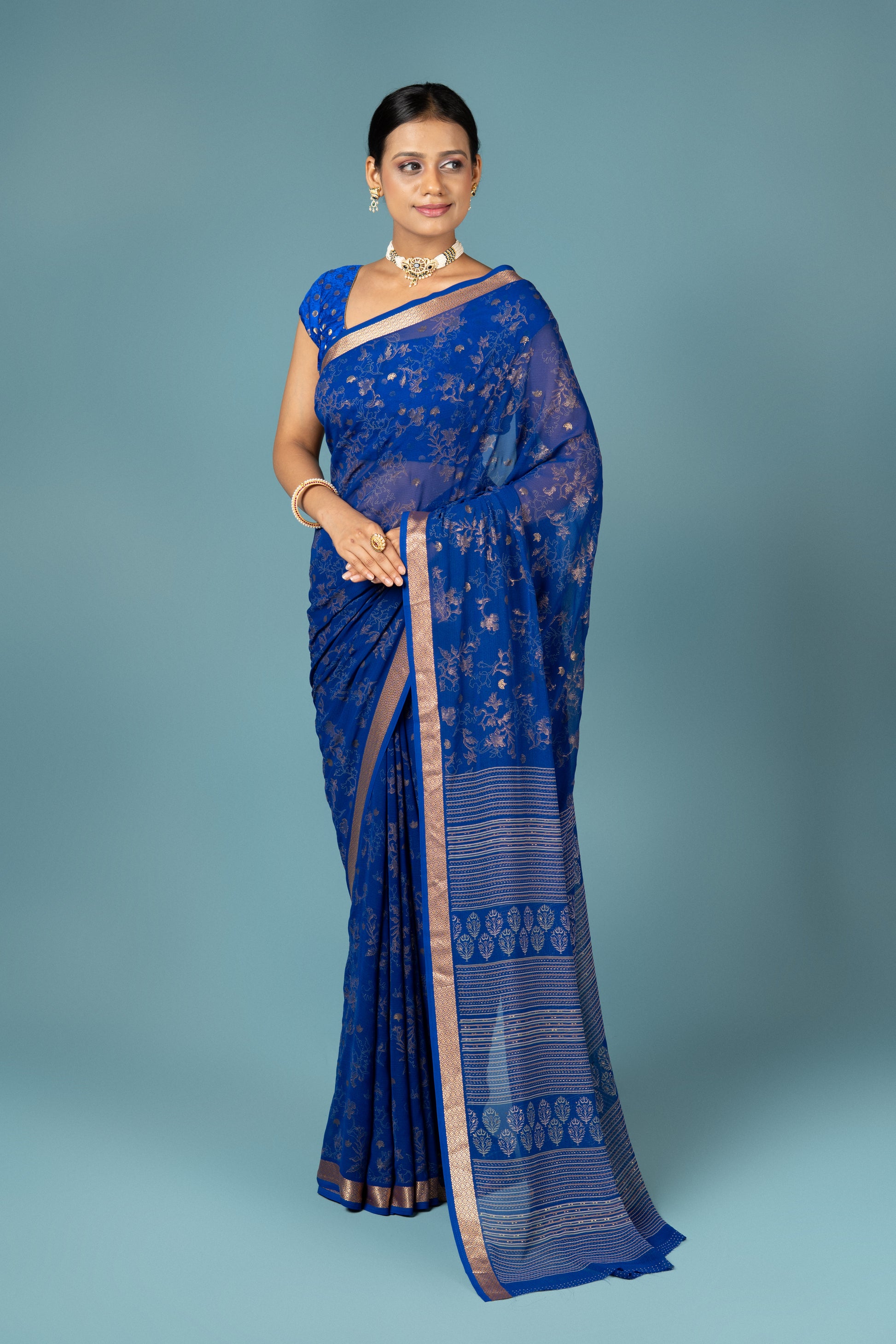 Elevate your wardrobe with our exclusive Royal Blue Chiffon Saree. Featuring a beautiful Peach hue, this piece effortlessly blends timeless tradition with modern elegance. Ideal for festive occasions or everyday sophistication. Shop now and make it yours.