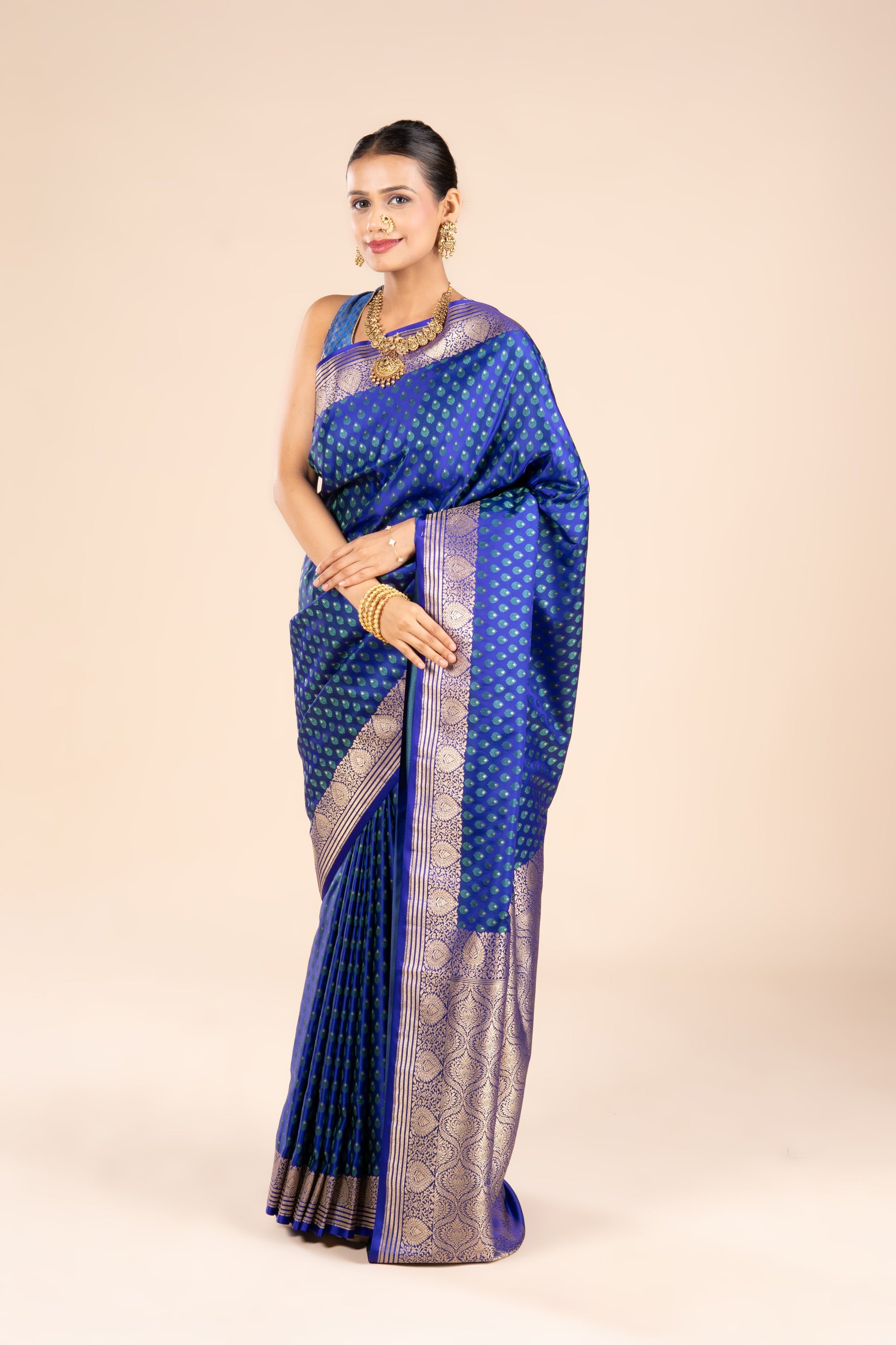 Celebrate culture and grace in this unique Royal Blue Soft Silk Banarasi Saree. Designed in fine fabric, it captures the essence of festive dressing. The perfect attire for ceremonies, pujas, or elegant nights out. Wear it with minimalist jewellery to let the saree shine.