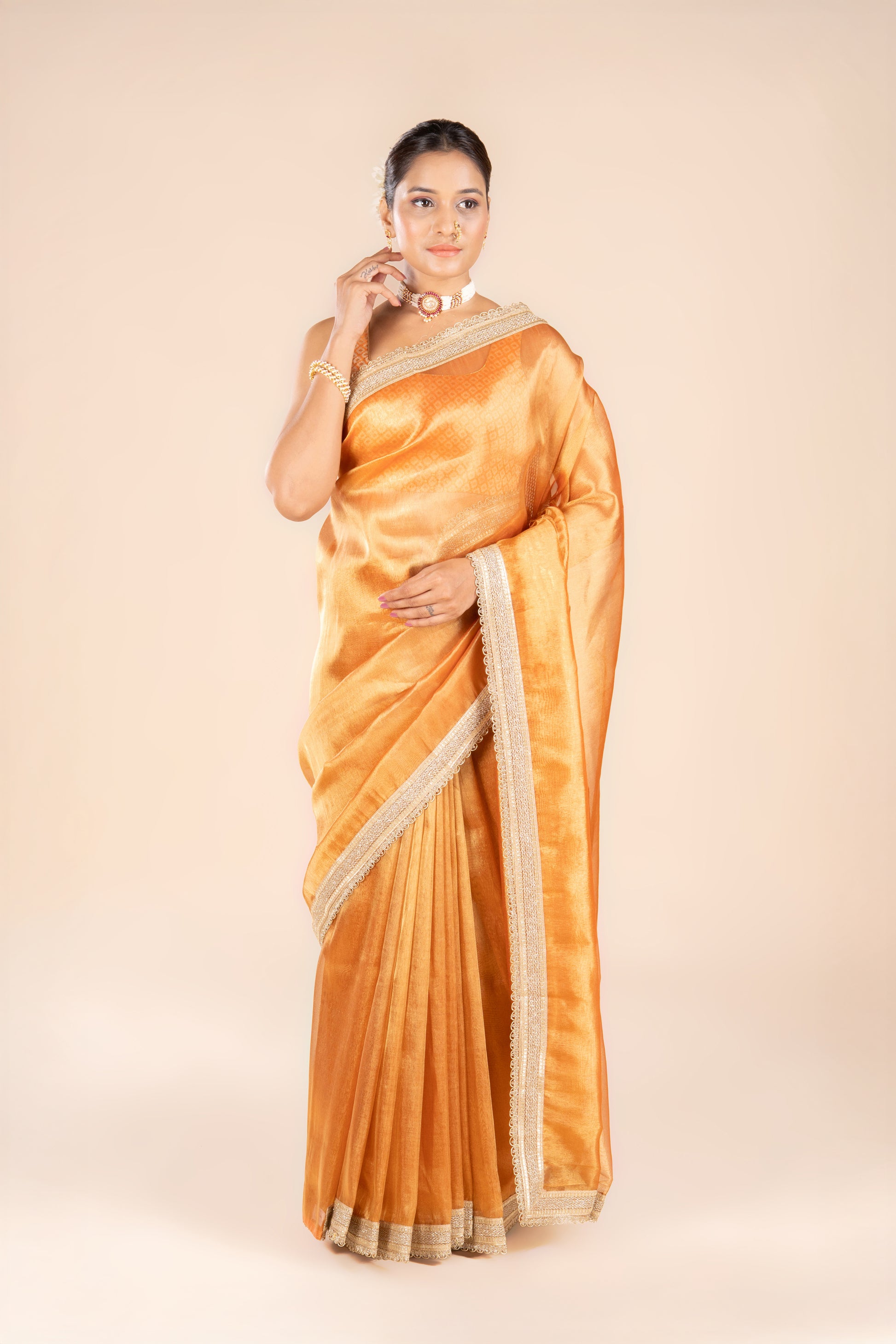 Bring home a saree that blends luxury and comfort — the Rust Tissue Silk Saree. Superior craftsmanship enhances the finesse of this luxurious fabric. The go-to choice for timeless festive and celebratory looks. Enhance it with kundan sets for a wedding-ready ensemble.