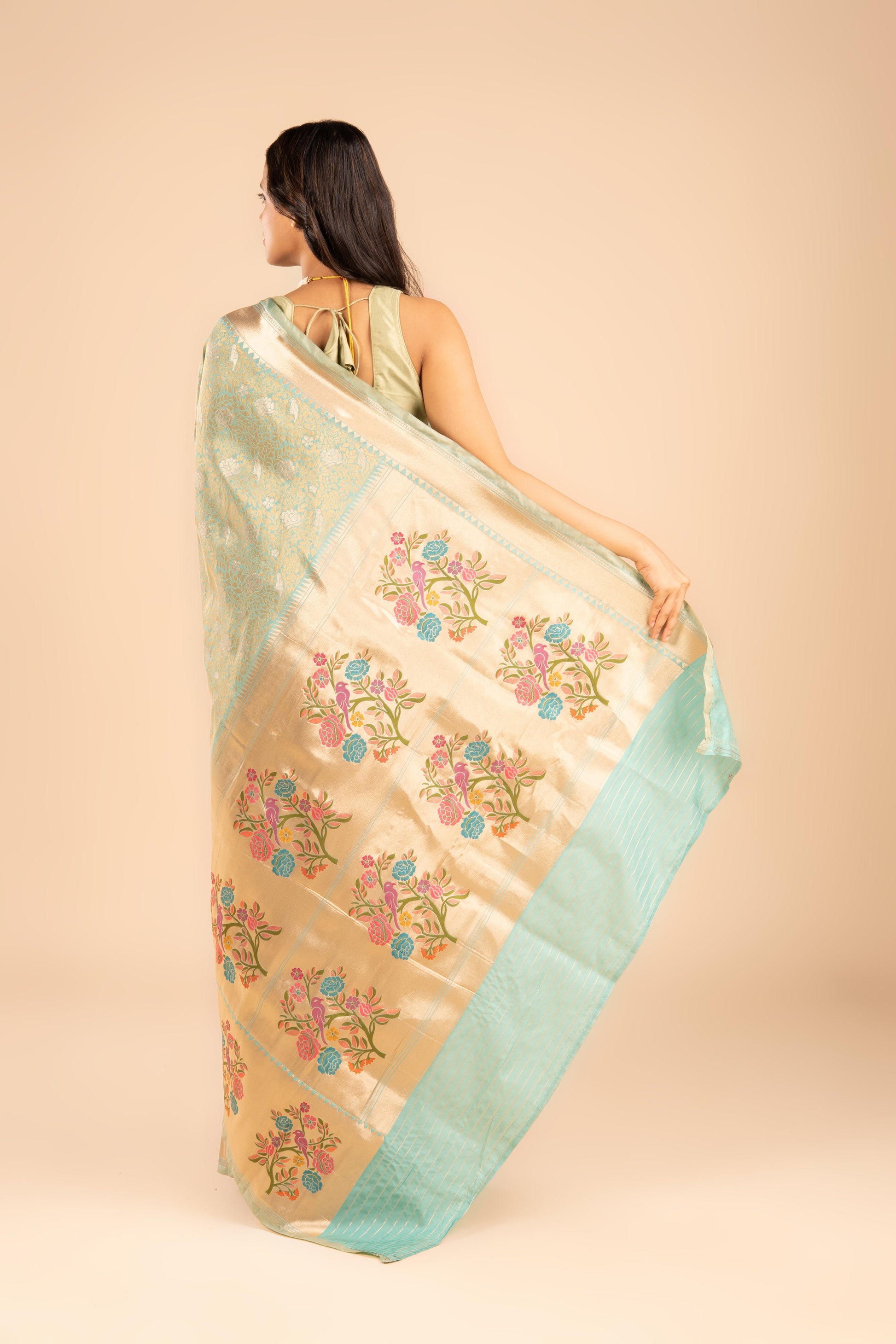 Experience the luxury of tradition with this exquisite Sea Green Katan Silk Brocade Saree. Made using fine textiles, it reflects a perfect harmony of tradition and luxury. Wear it to parties, cultural events, or joyous occasions. Match it with statement accessories to stand out effortlessly.