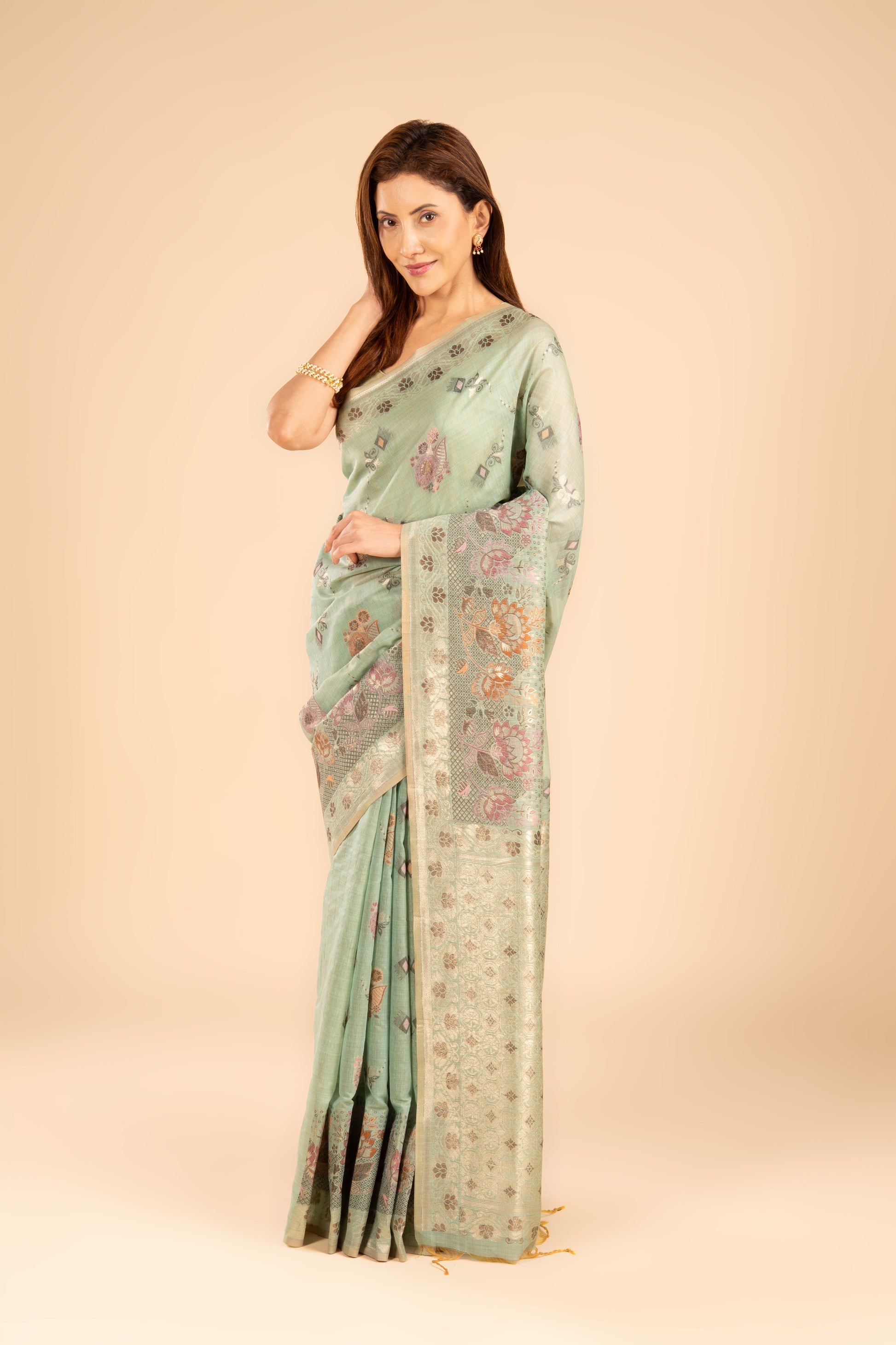 This Sea Green Silk Linen Saree is a masterpiece that reflects timeless craftsmanship. Woven from premium fabrics, it offers a rich texture and graceful drape. An ideal pick for weddings, festive gatherings, or grand celebrations. Pair it with antique jewellery for a heritage-inspired look.