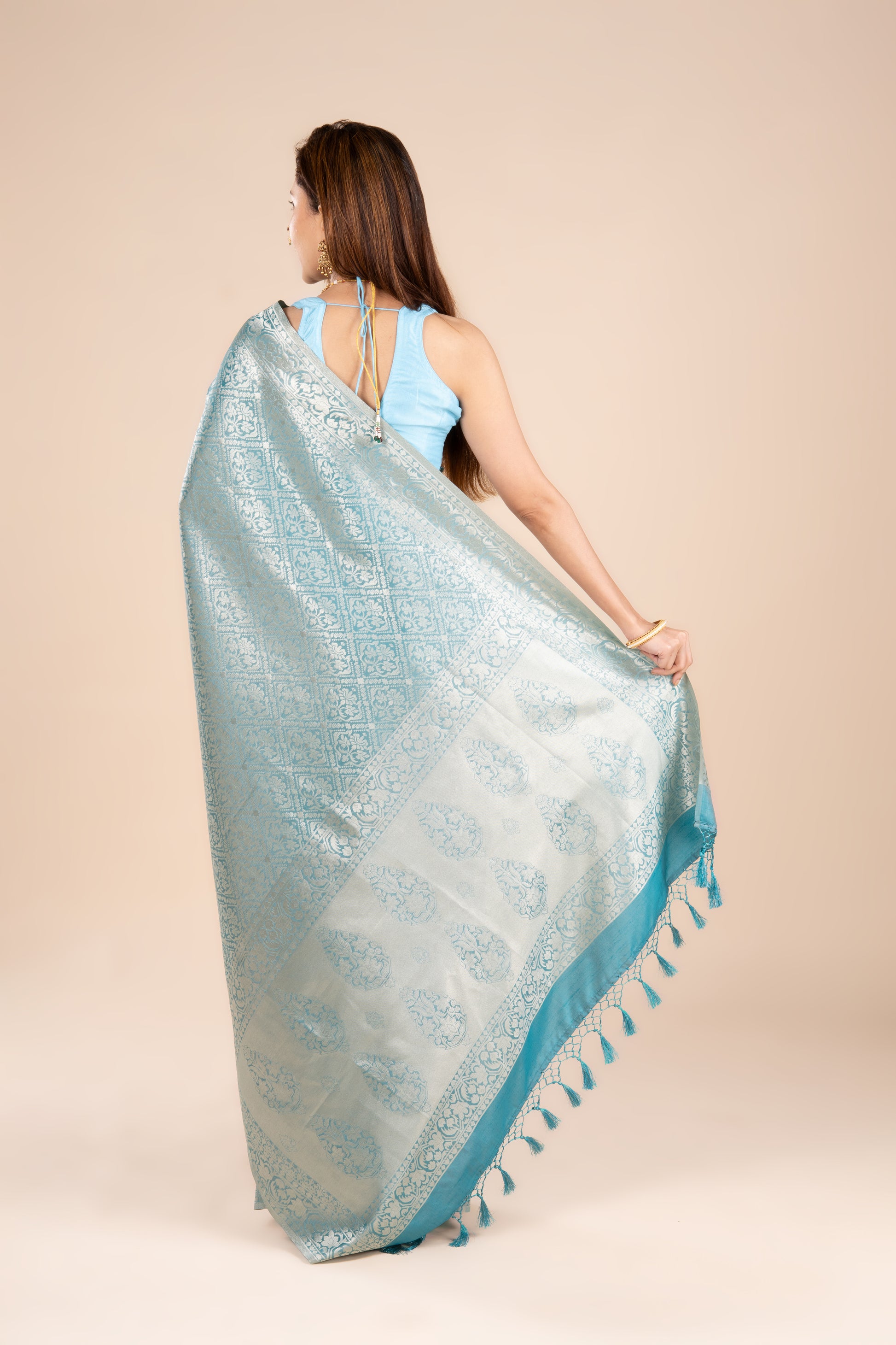 Discover elegance redefined with this Sea Green Soft Silk Brocade Saree. Skillfully designed, its texture brings out richness in every fold. An outfit that transitions beautifully from daytime rituals to evening galas. Elevate the look with temple jewellery for traditional grace.