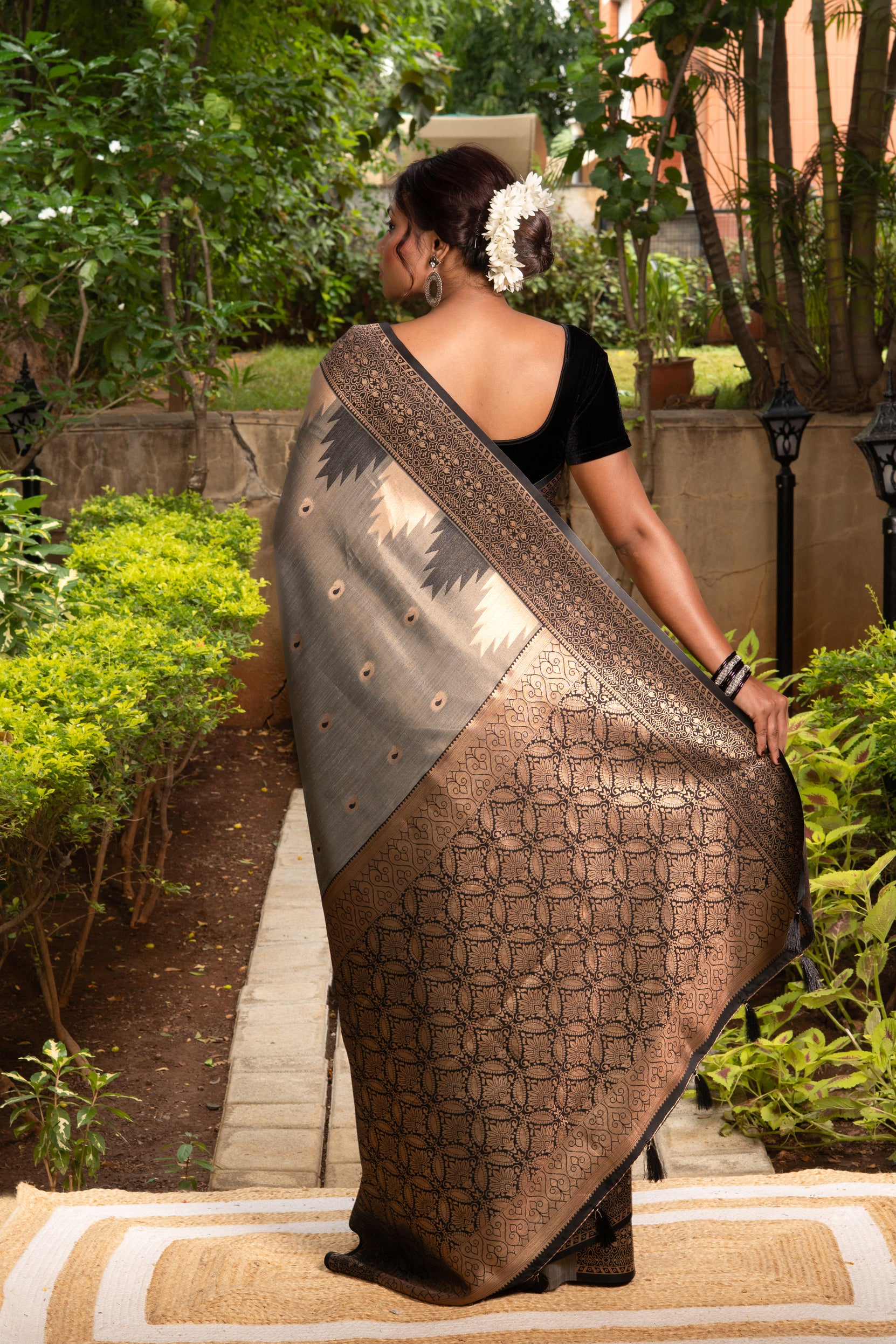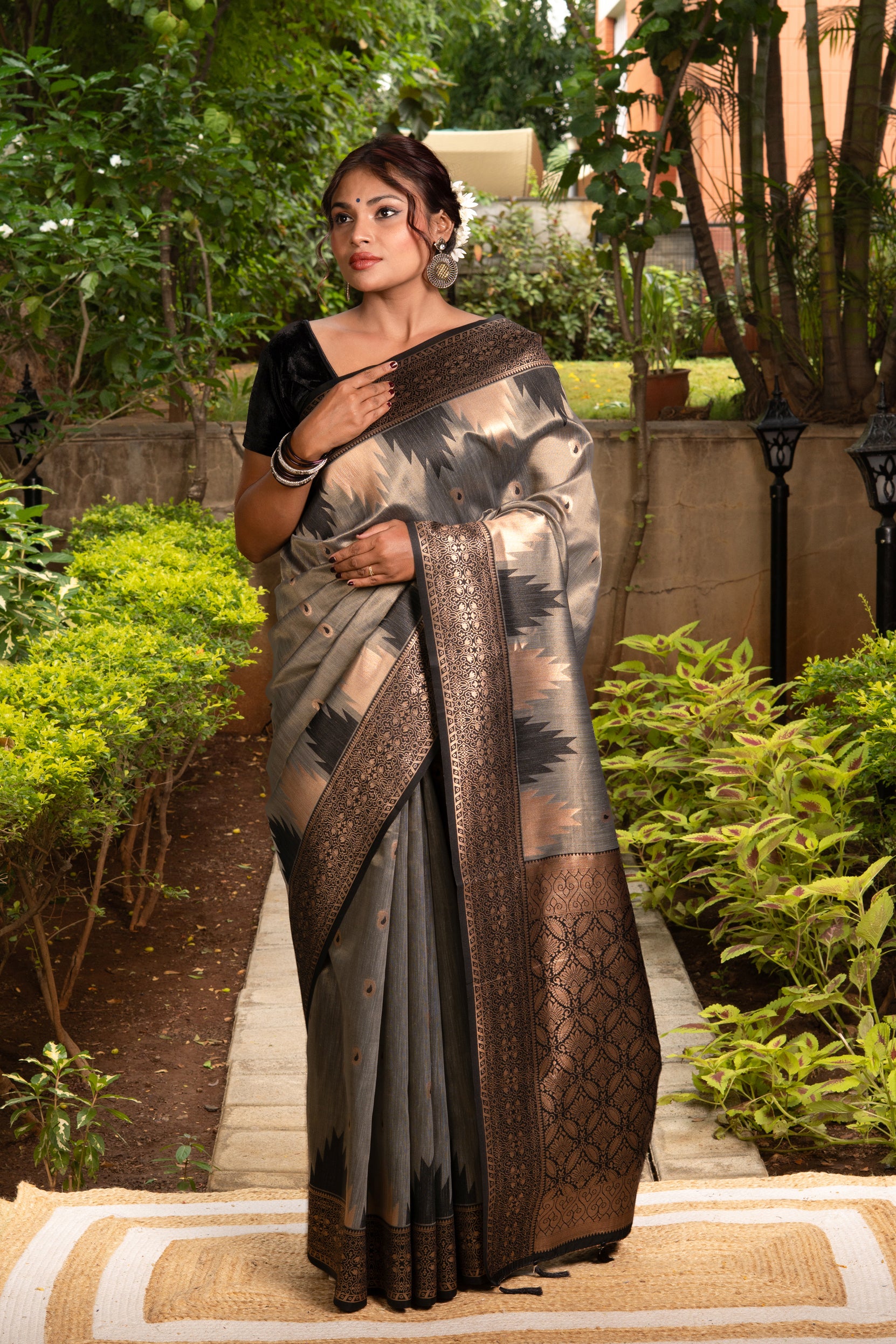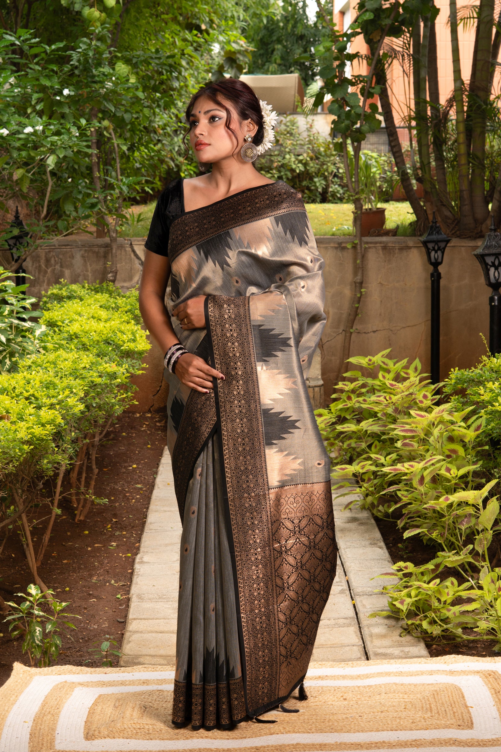 Elevate your wardrobe with our exclusive Steel Grey Tissue Silk Saree. Featuring a beautiful Steel Grey hue, this piece effortlessly blends timeless tradition with modern elegance. Ideal for festive occasions or everyday sophistication. Shop now and make it yours.
