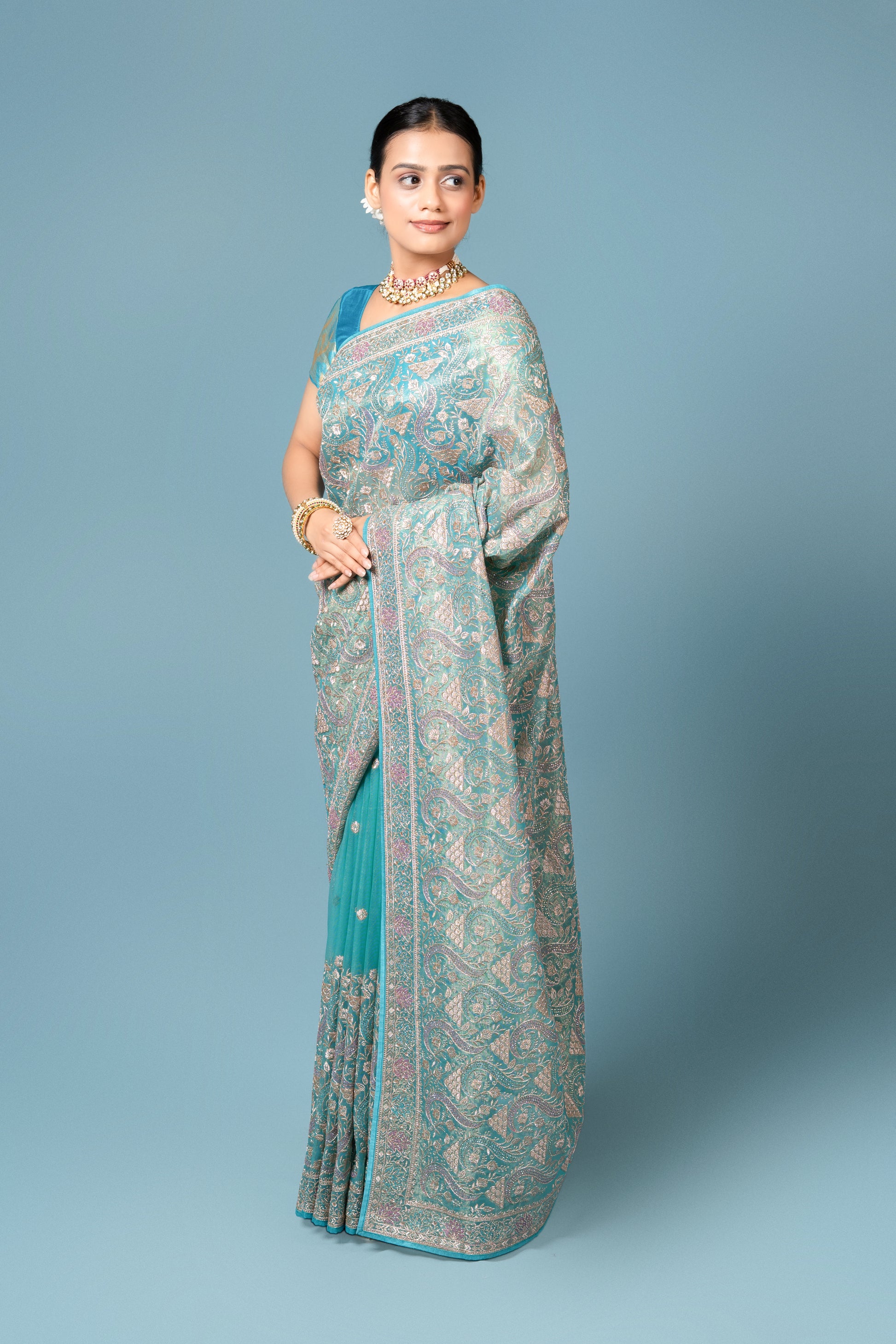 Shimmering with elegance, this Turquoise Georgette Saree with Stone Work is a statement piece from Hastakala Exclusive. Crafted in lightweight georgette, the saree drapes beautifully, offering both grace and comfort. The vibrant turquoise hue is enhanced with intricate stone embellishments that sparkle under every light, while the blend of gold and silver zari accents adds a rich traditional touch.