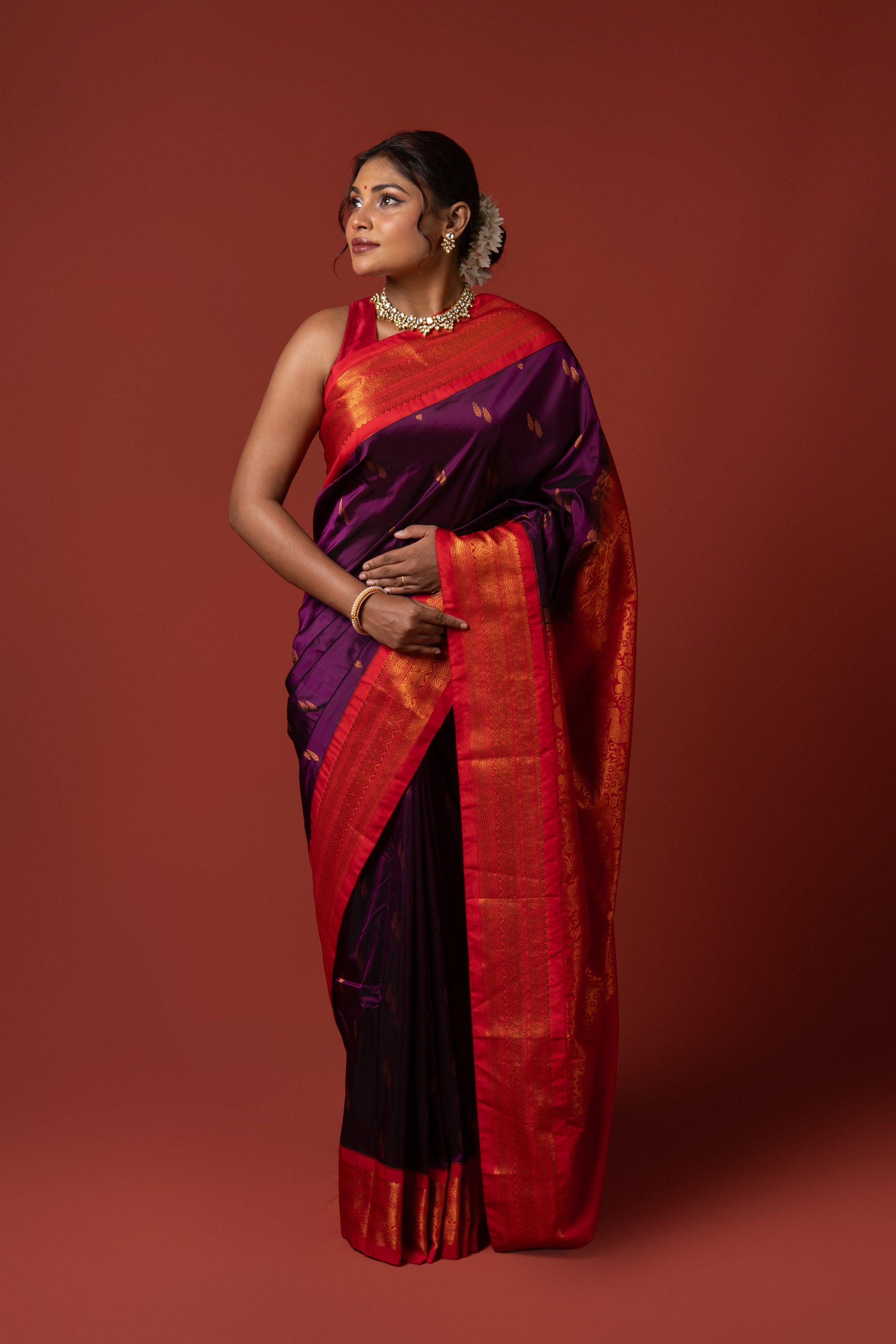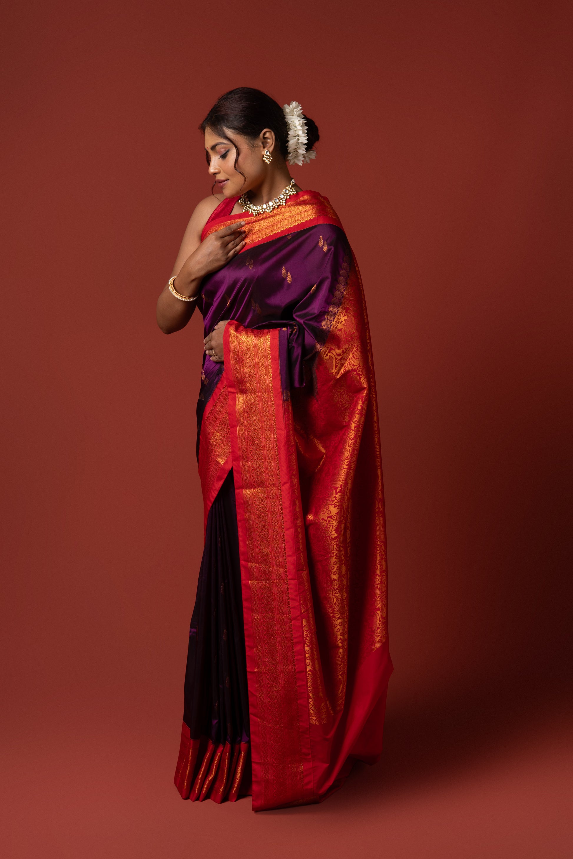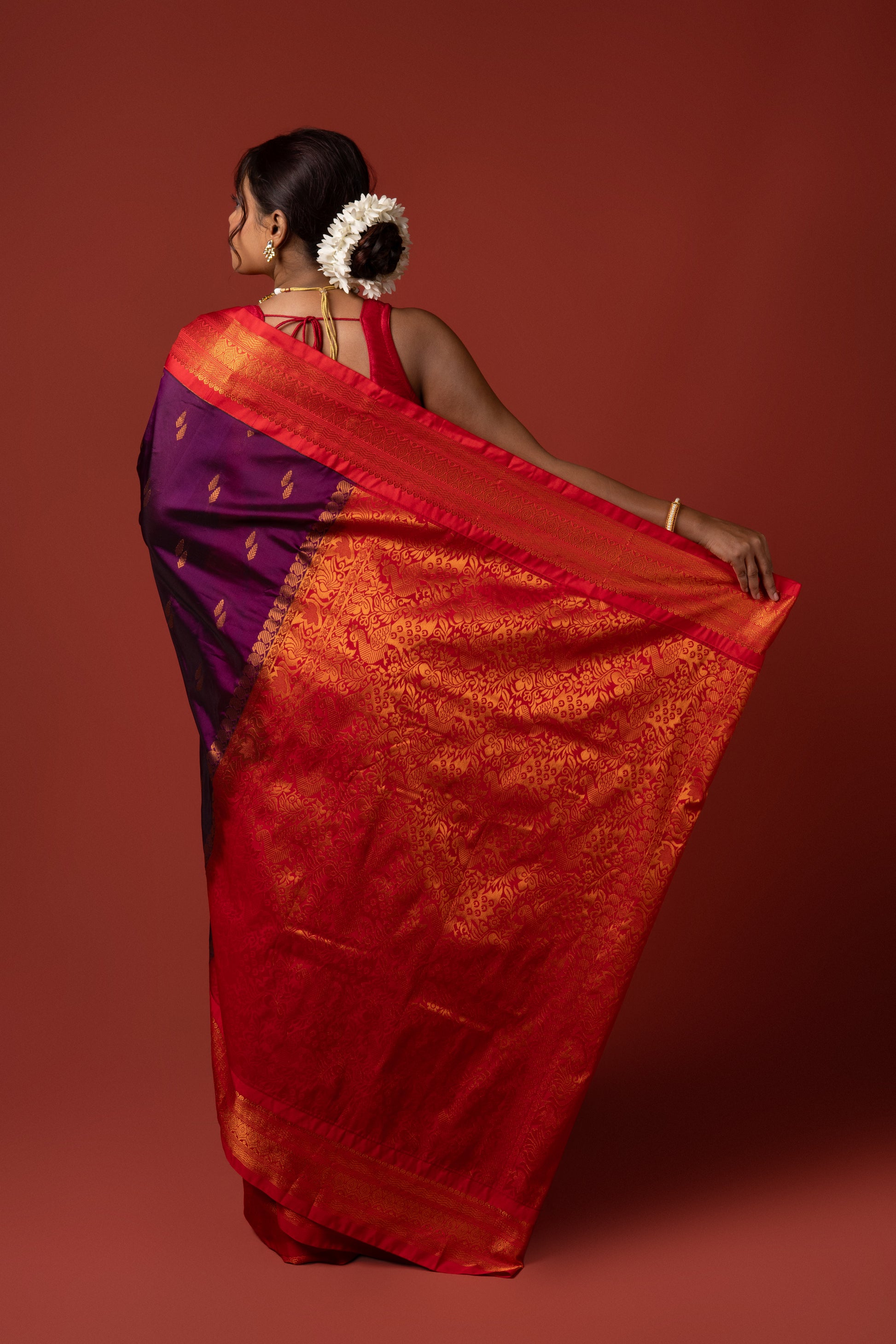 The deep wine base adds a touch of elegance, while the contrasting red blouse piece creates a striking combination, perfect for festive celebrations, puja ceremonies, and cultural occasions. With its graceful drape and heritage-inspired design, this saree is a must-have for women who appreciate classic traditions with a royal touch.