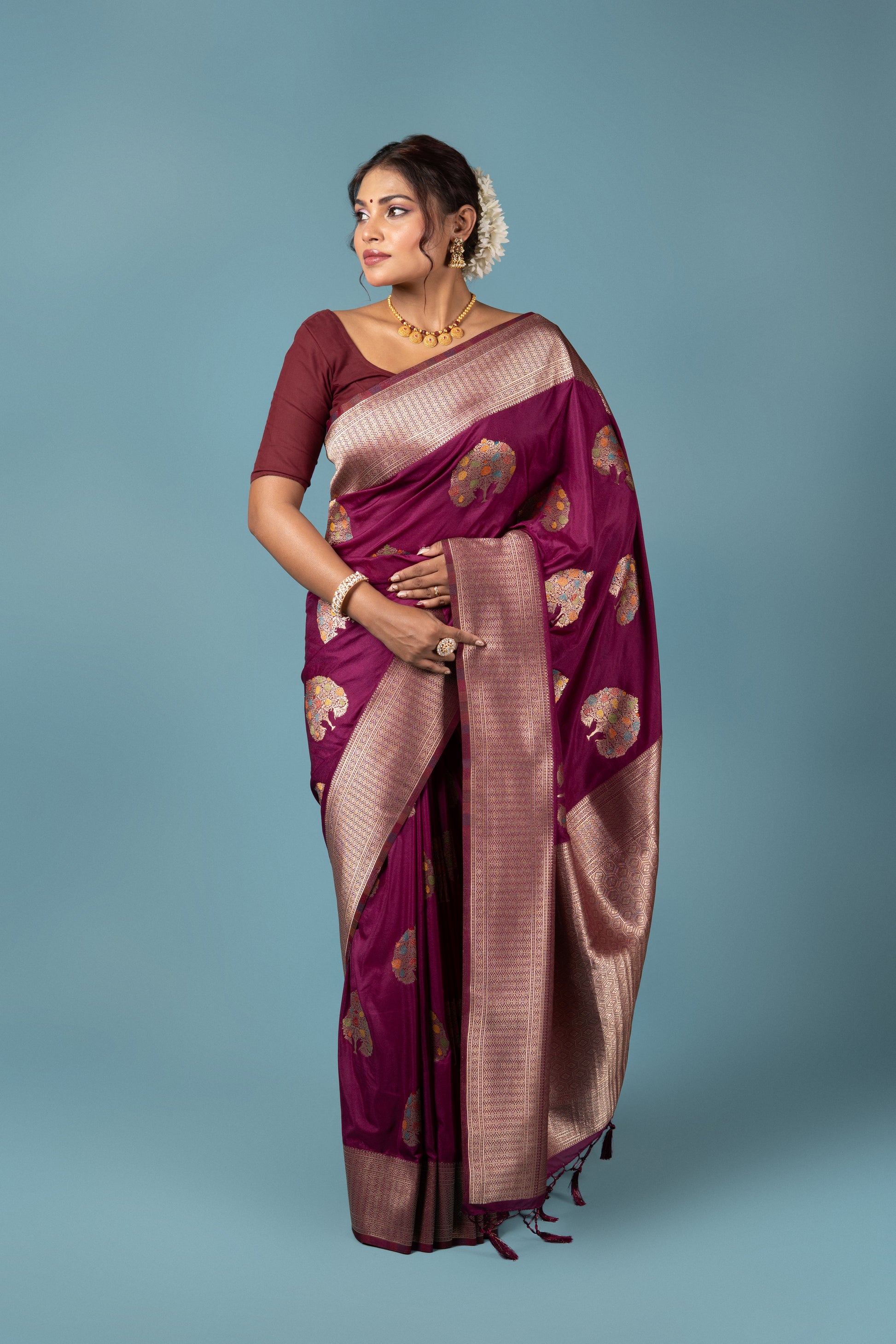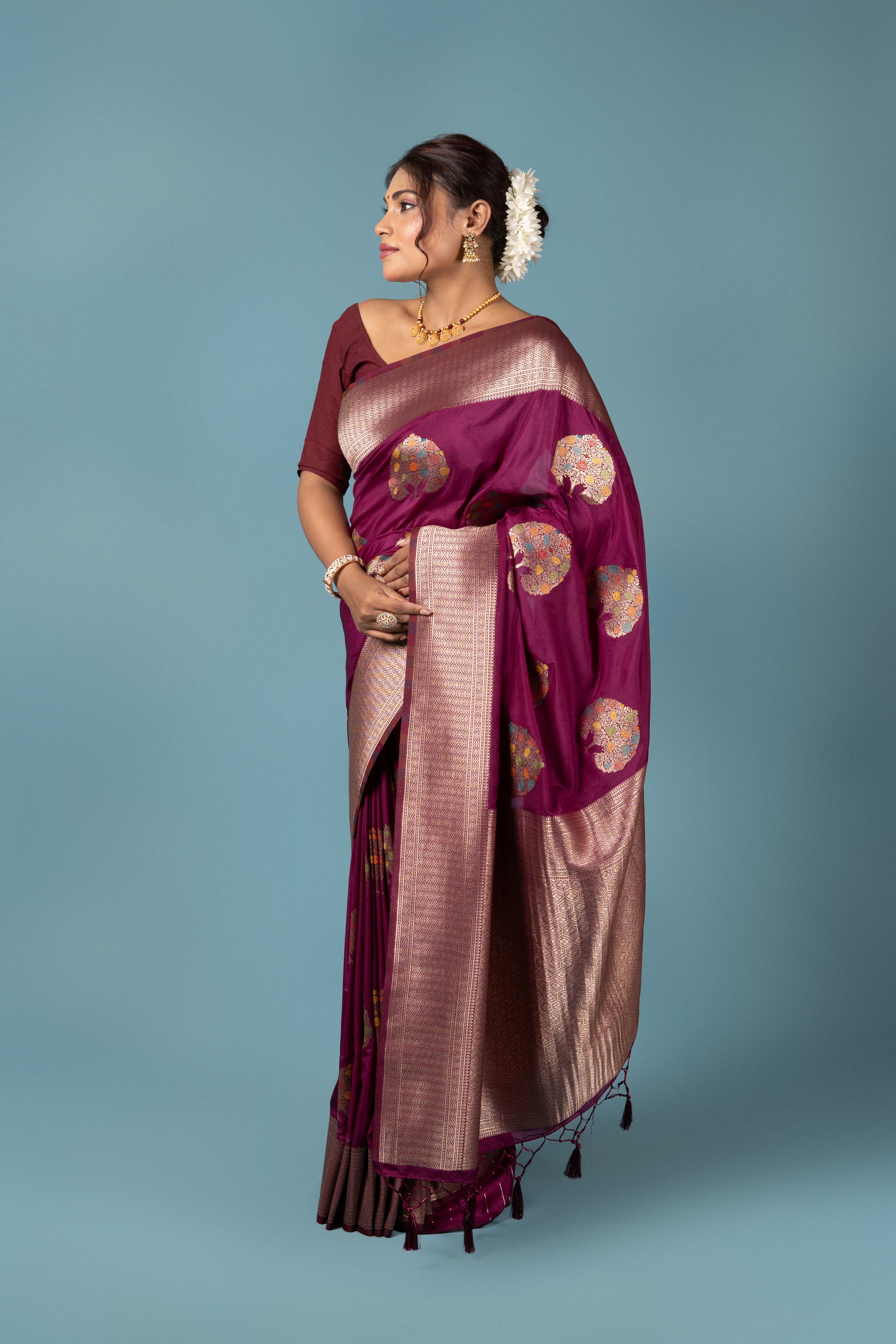 Elevate your wardrobe with our exclusive Wine Georgette Banarasi Saree. Featuring a beautiful Wine hue, this piece effortlessly blends timeless tradition with modern elegance. Ideal for festive occasions or everyday sophistication. Shop now and make it yours.