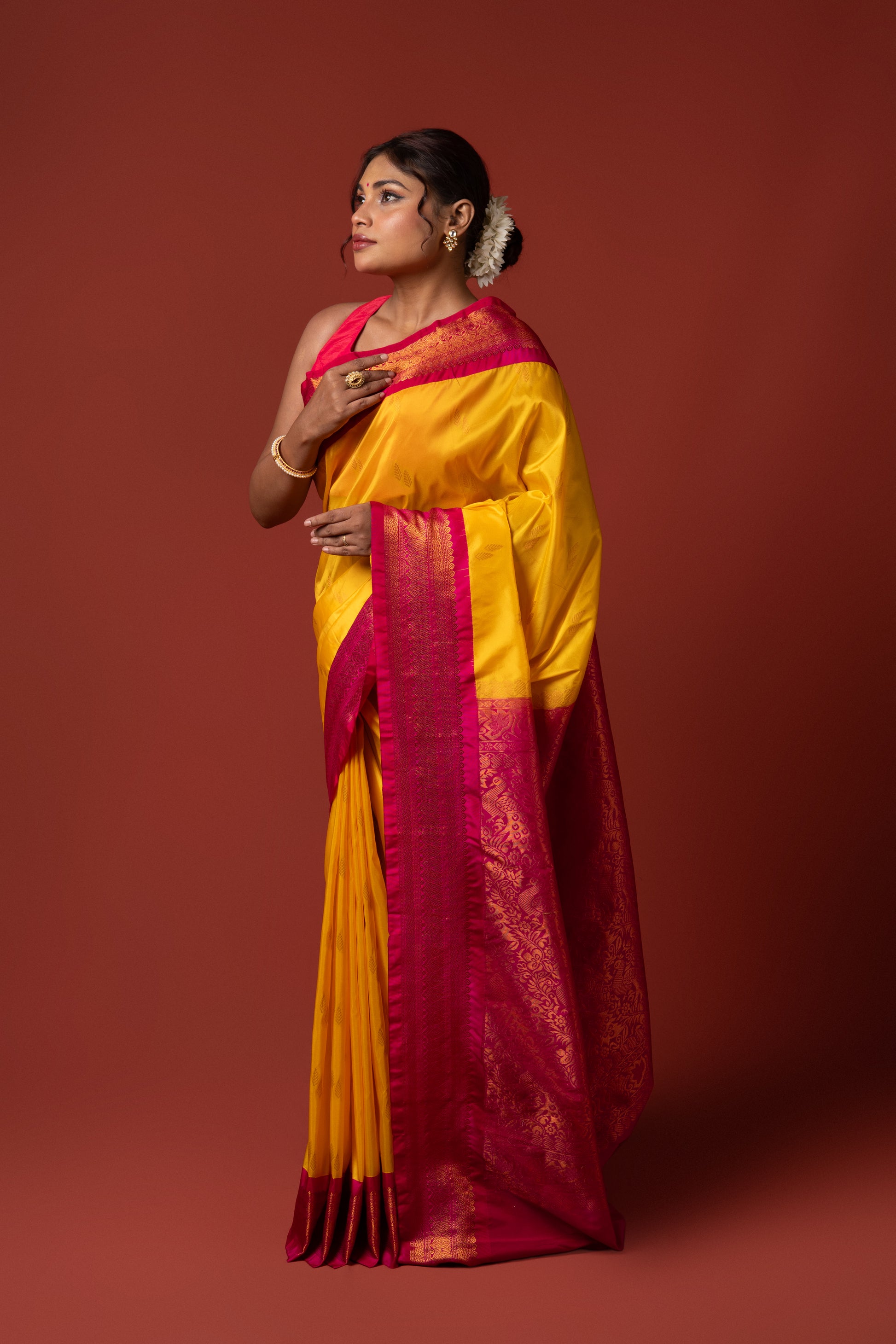 Elevate your wardrobe with our exclusive Yellow Apurva Silk Gadwal Saree. Featuring a beautiful Yellow hue, this piece effortlessly blends timeless tradition with modern elegance. Ideal for festive occasions or everyday sophistication. Shop now and make it yours.