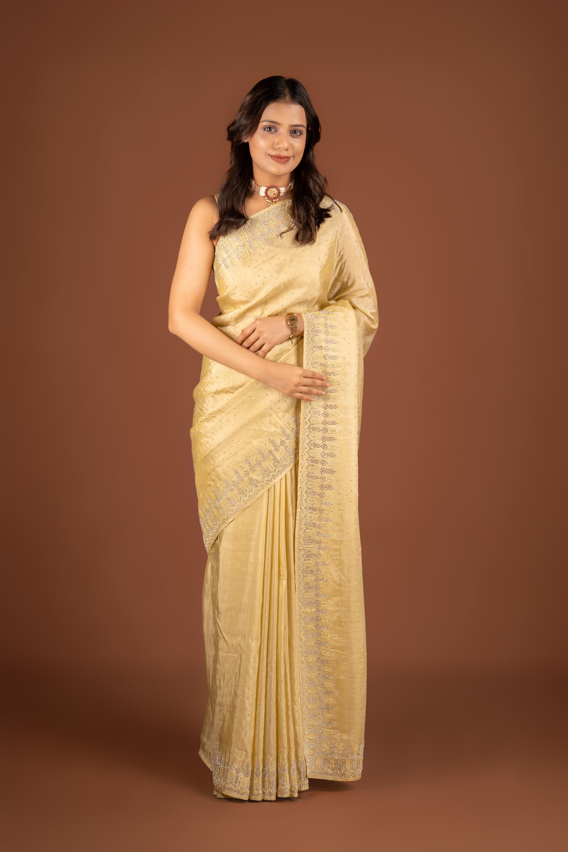 Bring home a saree that blends luxury and comfort — the Yellow Georgette Saree With Stone Work. Superior craftsmanship enhances the finesse of this luxurious fabric. The go-to choice for timeless festive and celebratory looks. Enhance it with kundan sets for a wedding-ready ensemble.
