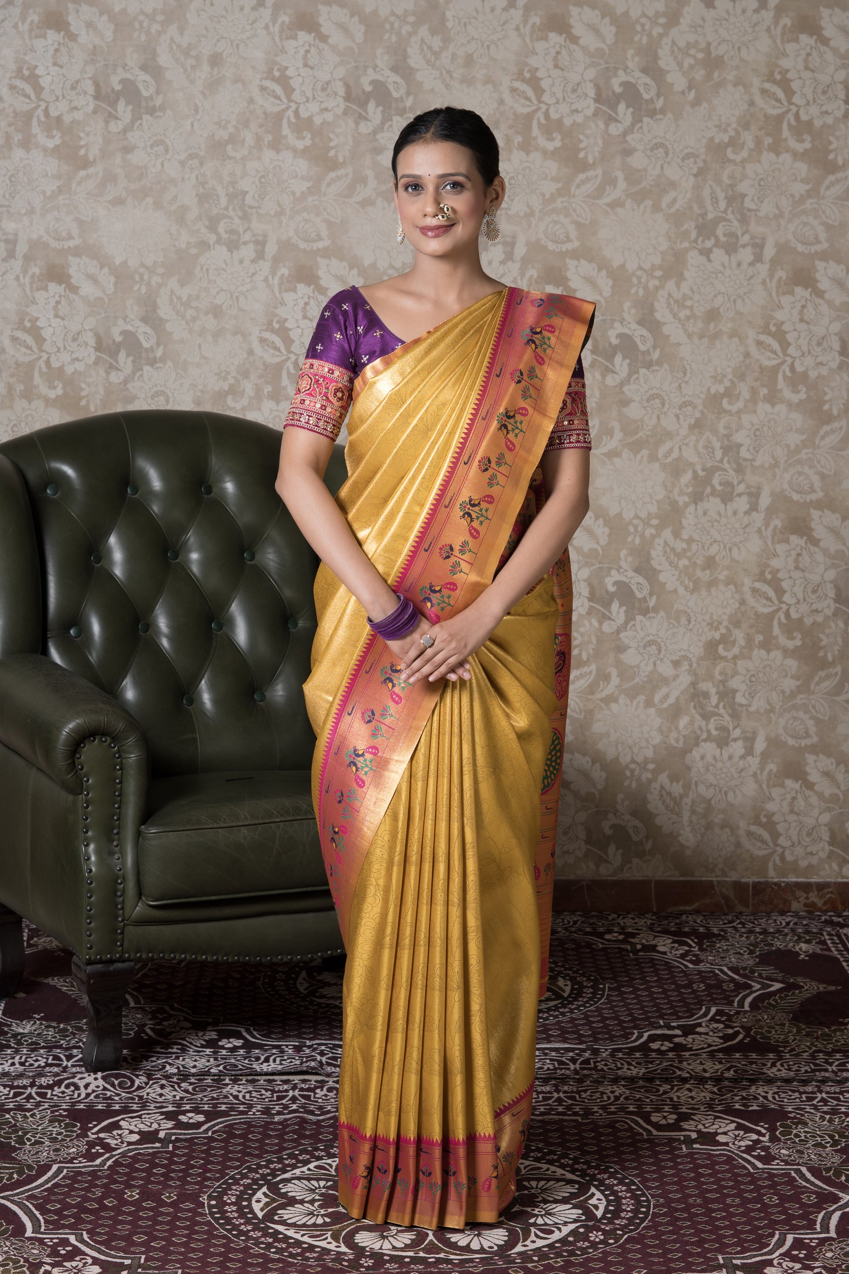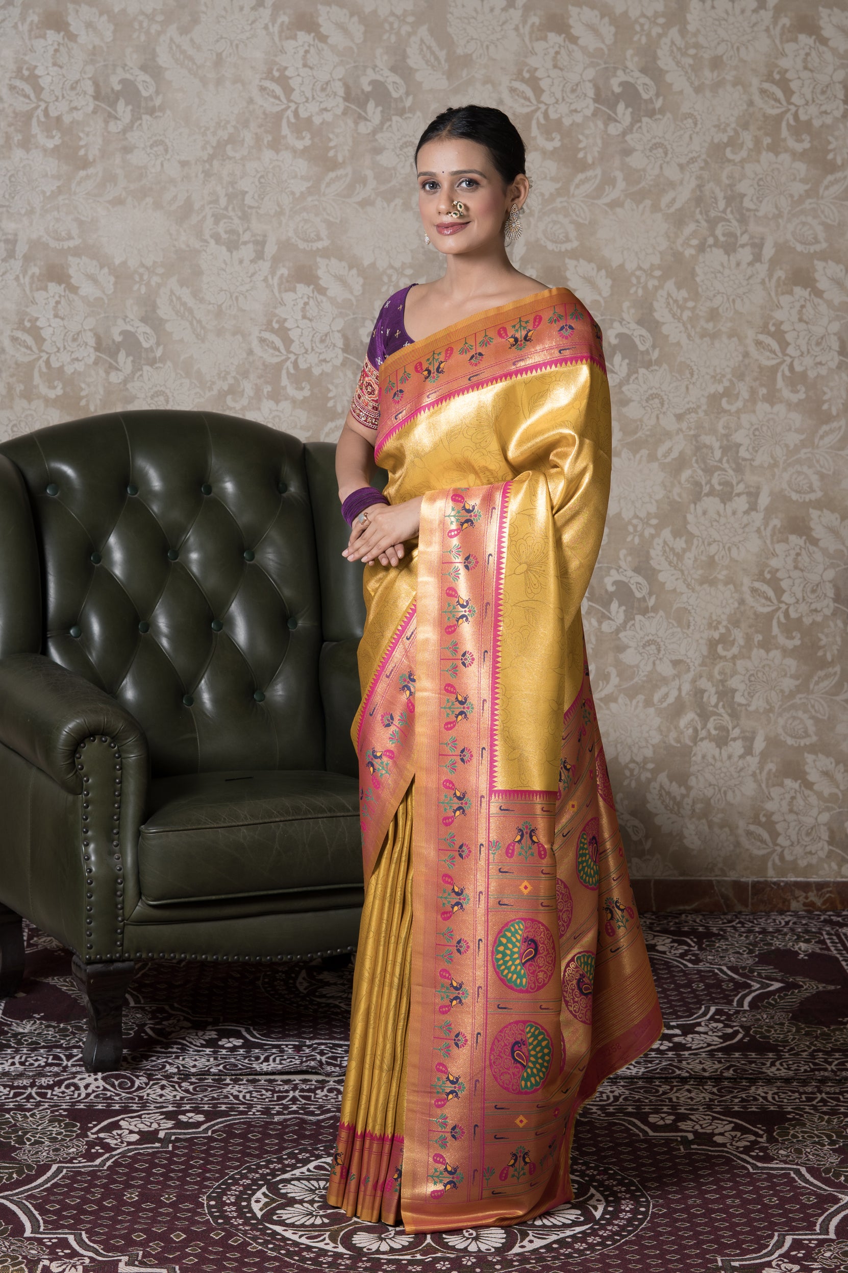 Elevate your wardrobe with our exclusive Yellow Gold Paithani Tissue Saree. Featuring a beautiful Yellow Gold hue, this piece effortlessly blends timeless tradition with modern elegance. Ideal for festive occasions or everyday sophistication. Shop now and make it yours.