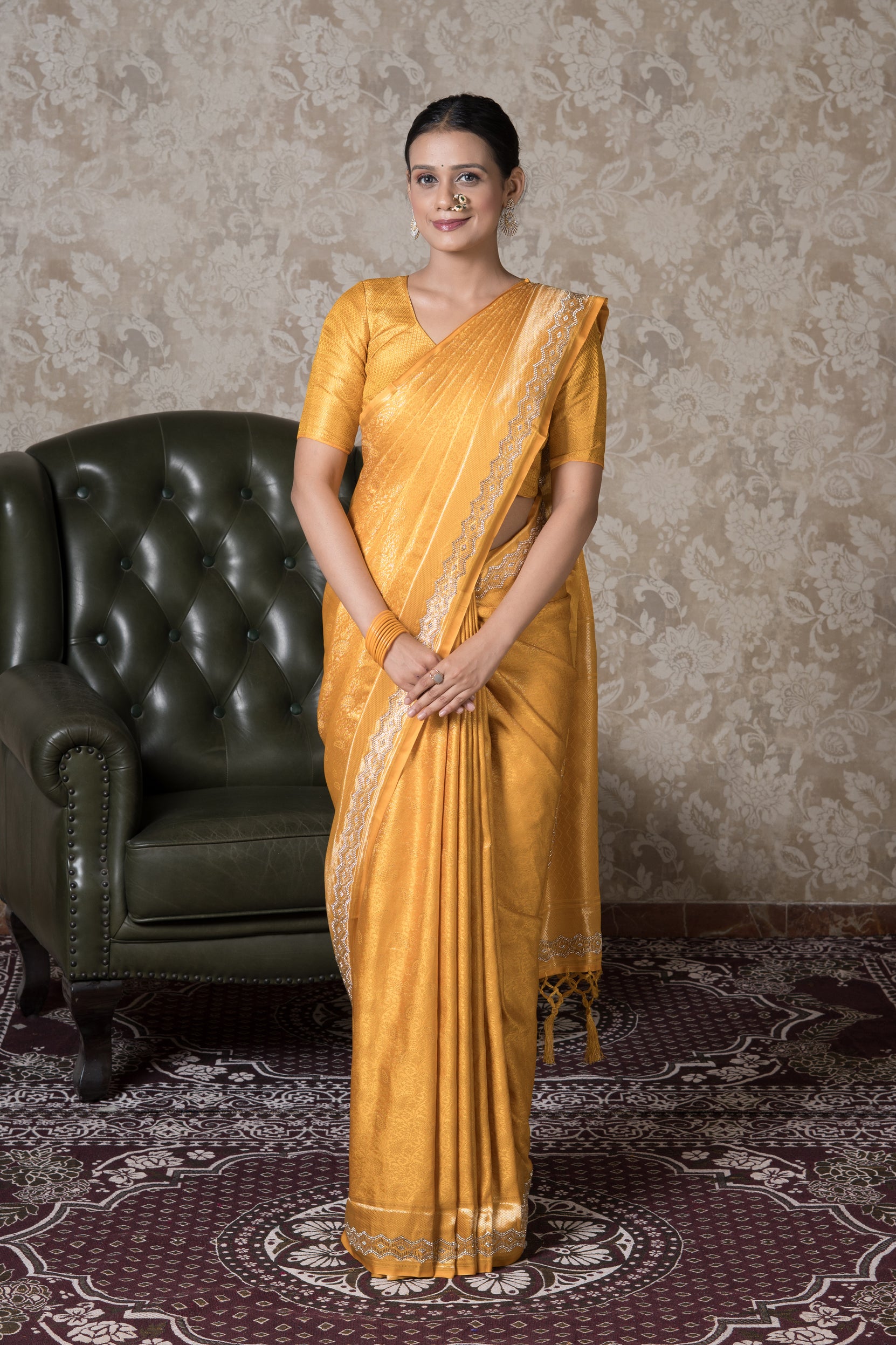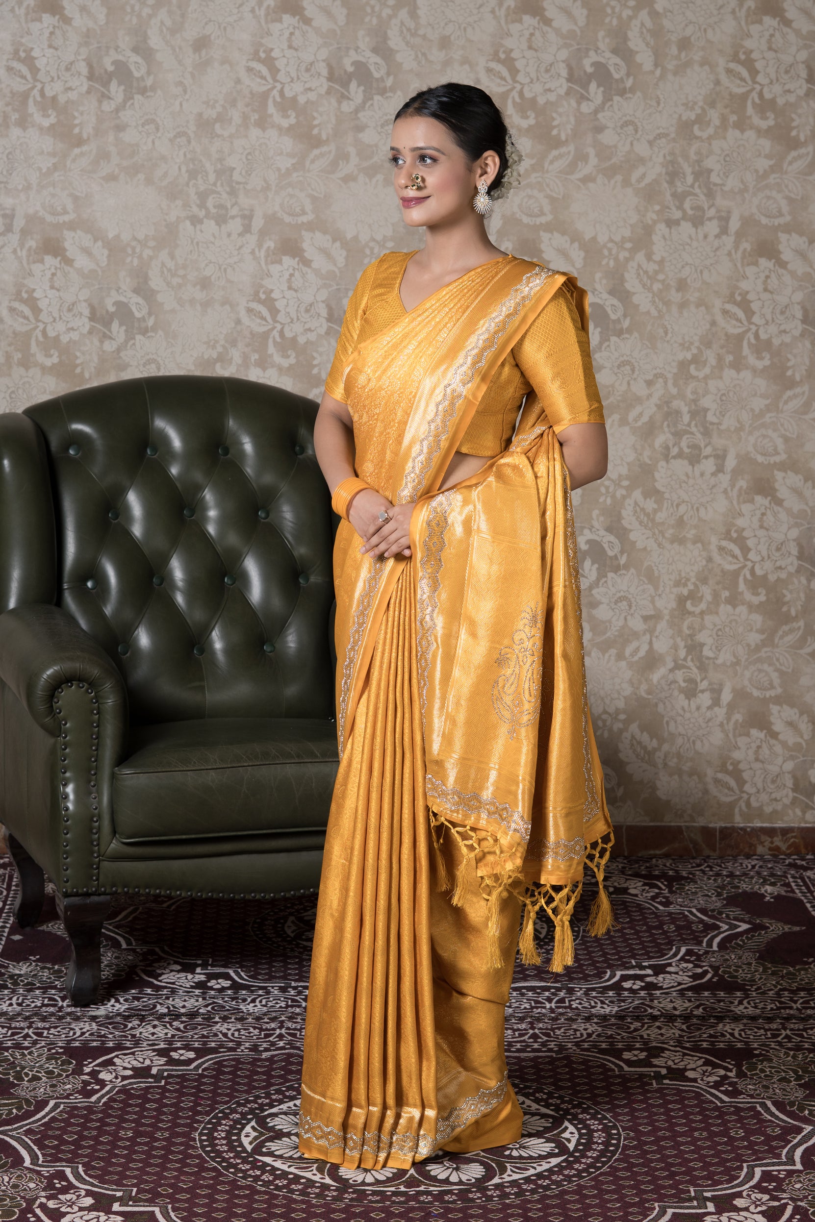 Elevate your wardrobe with our exclusive Yellow Katan Silk Banarasi Saree with Stonework. Featuring a beautiful Yellow hue, this piece effortlessly blends timeless tradition with modern elegance. Ideal for festive occasions or everyday sophistication. Shop now and make it yours.